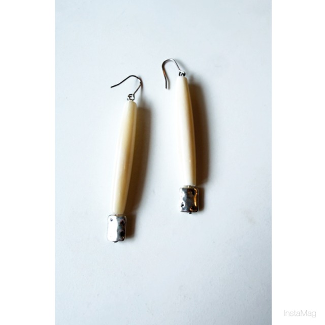 細長いボーンをメインにこだわって選んだシルバーパーツを合わせたピアス、イヤリングです。 軽くて使いやすいお品です! ✴︎サイズ 長さ約6.2㎝(ピアス部分除く) ✴︎素材 ボーン、メッキ
