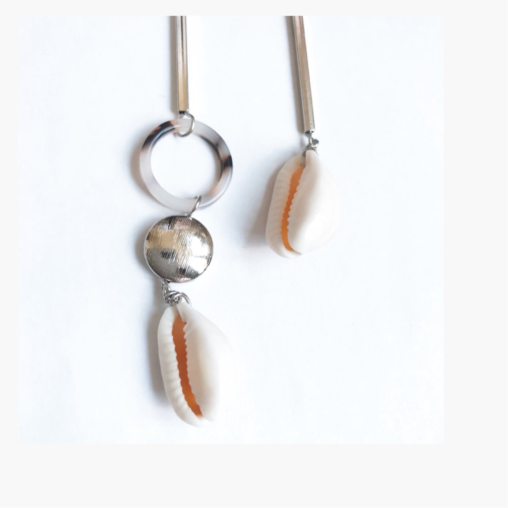 アセチルセルロース素材のべっこう風柄のリングにシルバー、そしてシェルのアシメントリーデザインのピアス、イヤリングです。