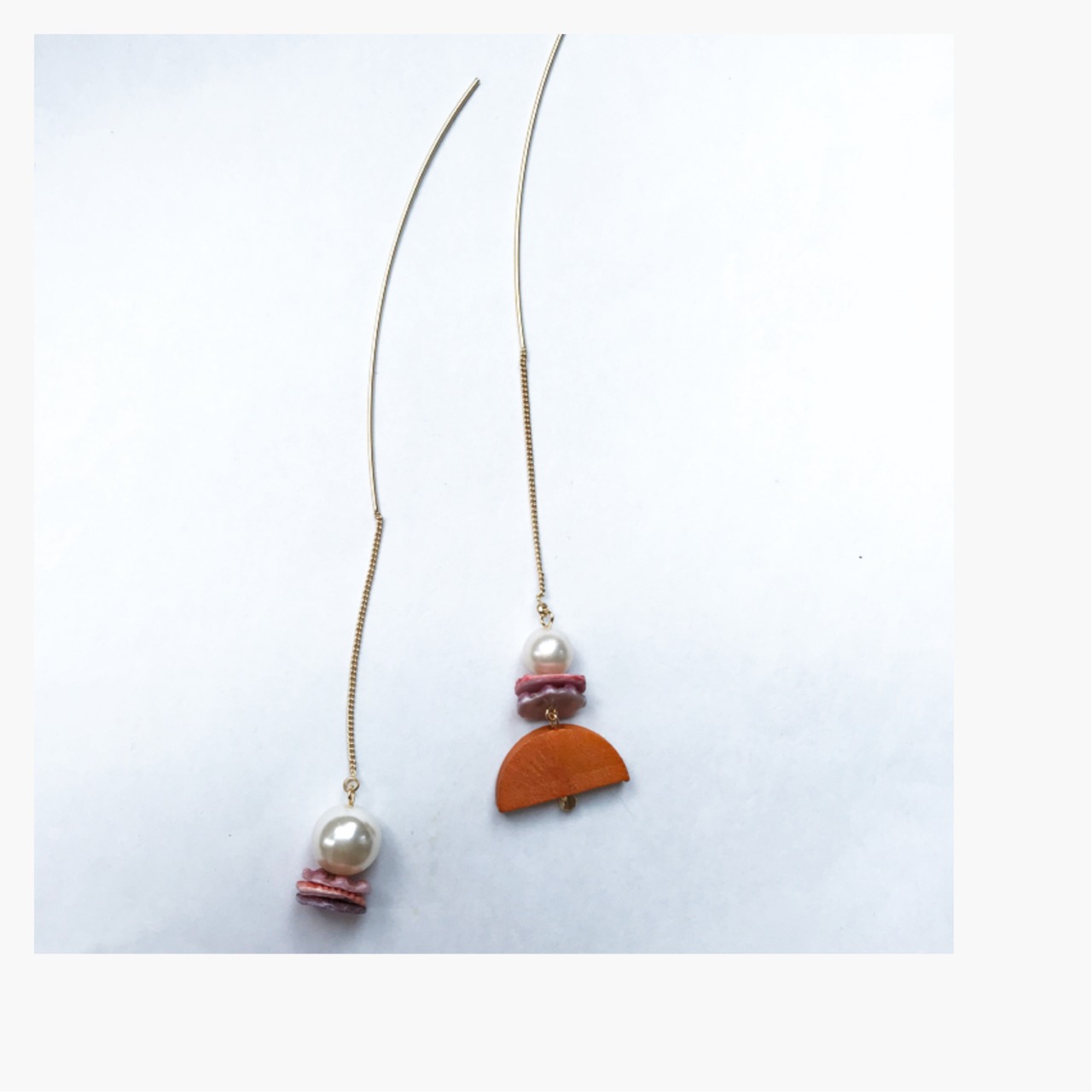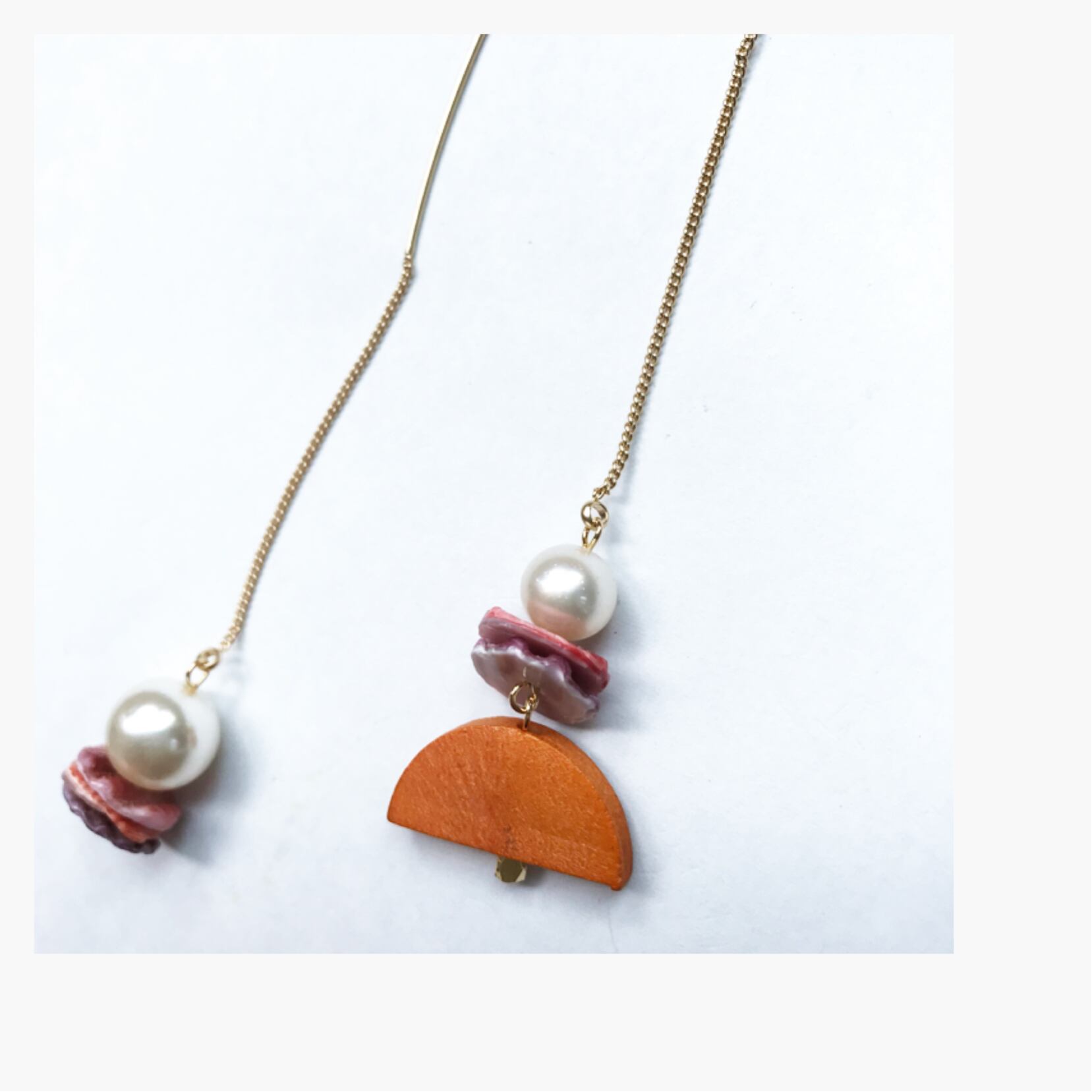 片方にはウッドでアクセントをつけたアシメントリーデザインのアメリカンピアスです!