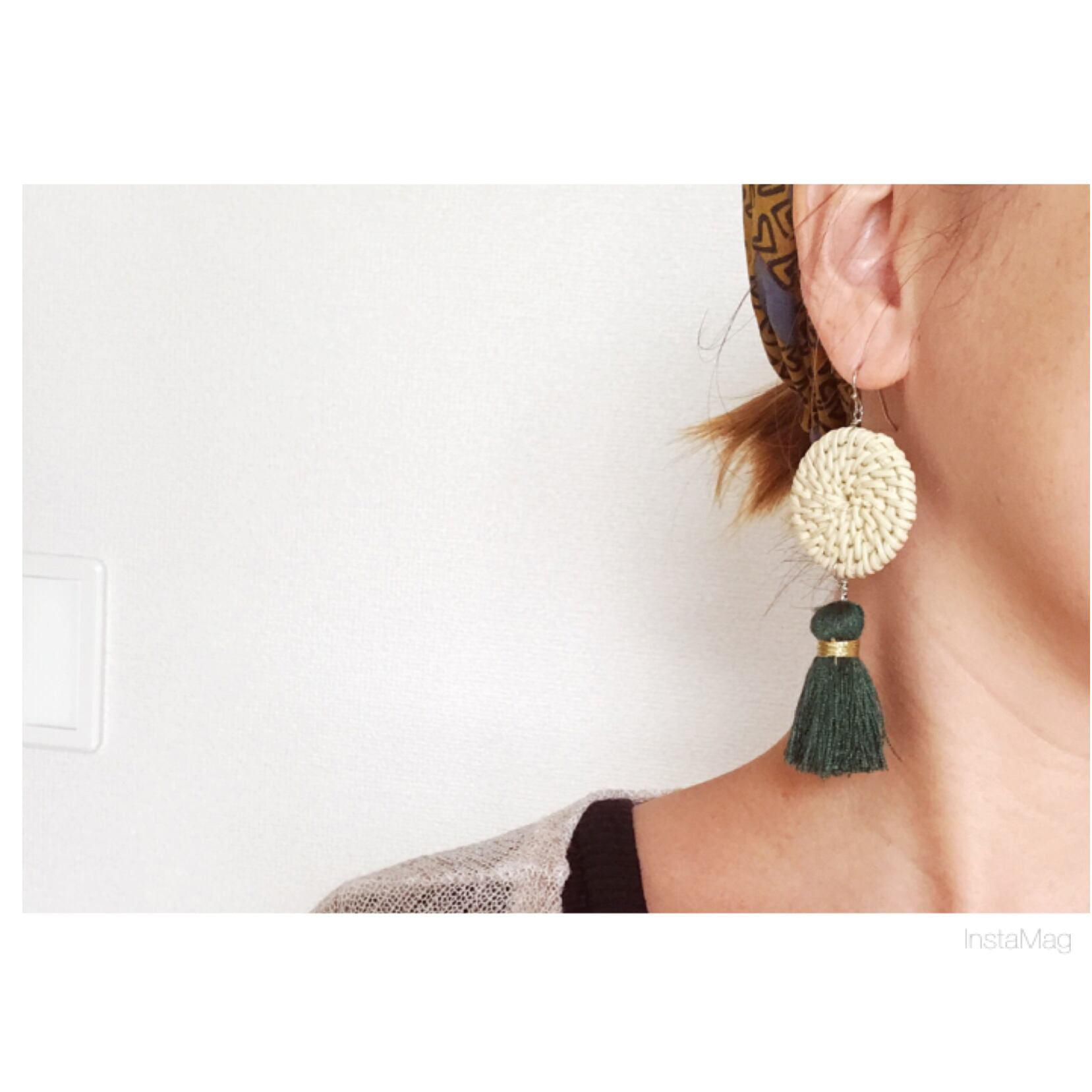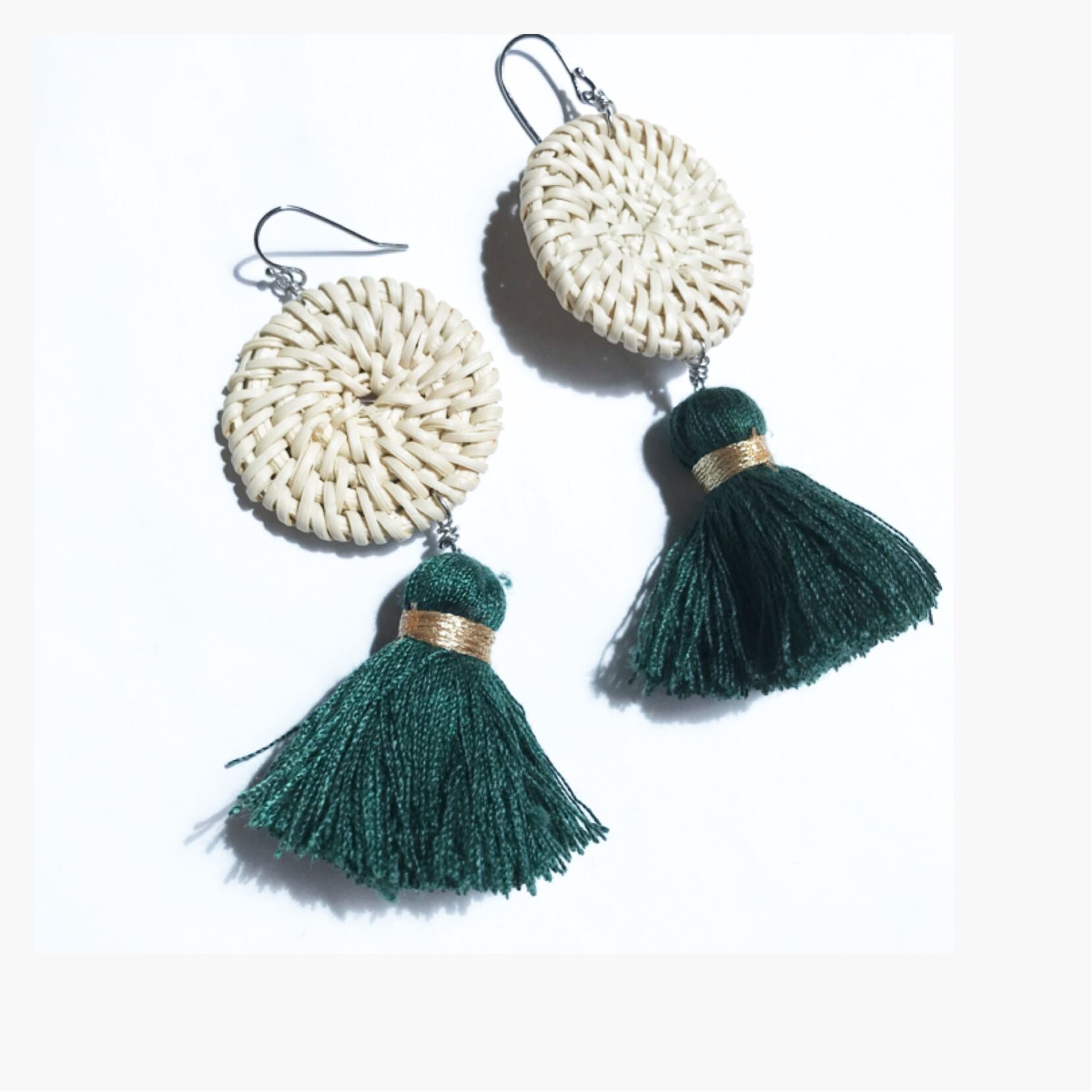 ラタン素材のサークルに大振りの深グリーンのタッセルを合わせたピアス、イヤリングです。