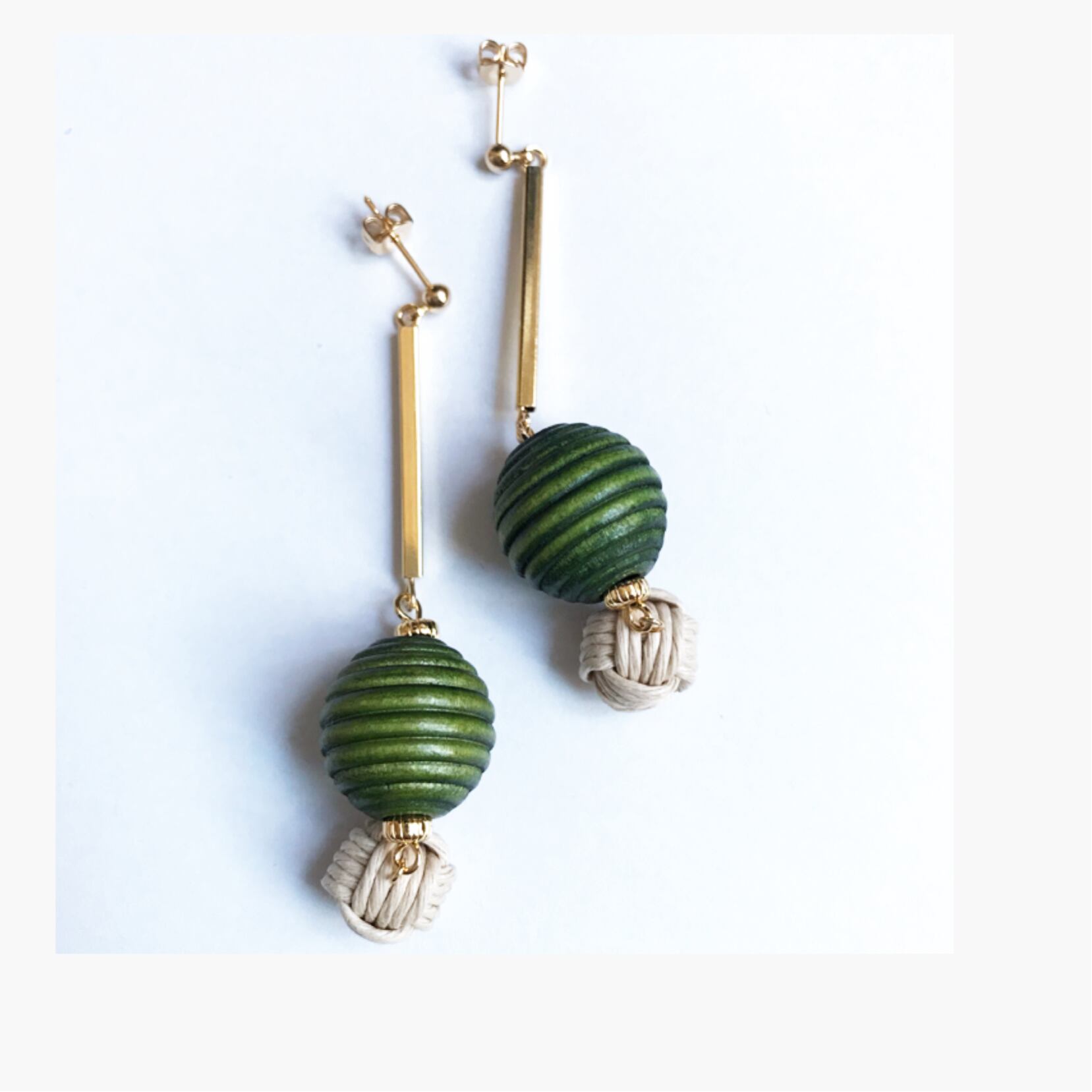 ウッドボールと、ラフィアボールのラインピアス、イヤリングです。