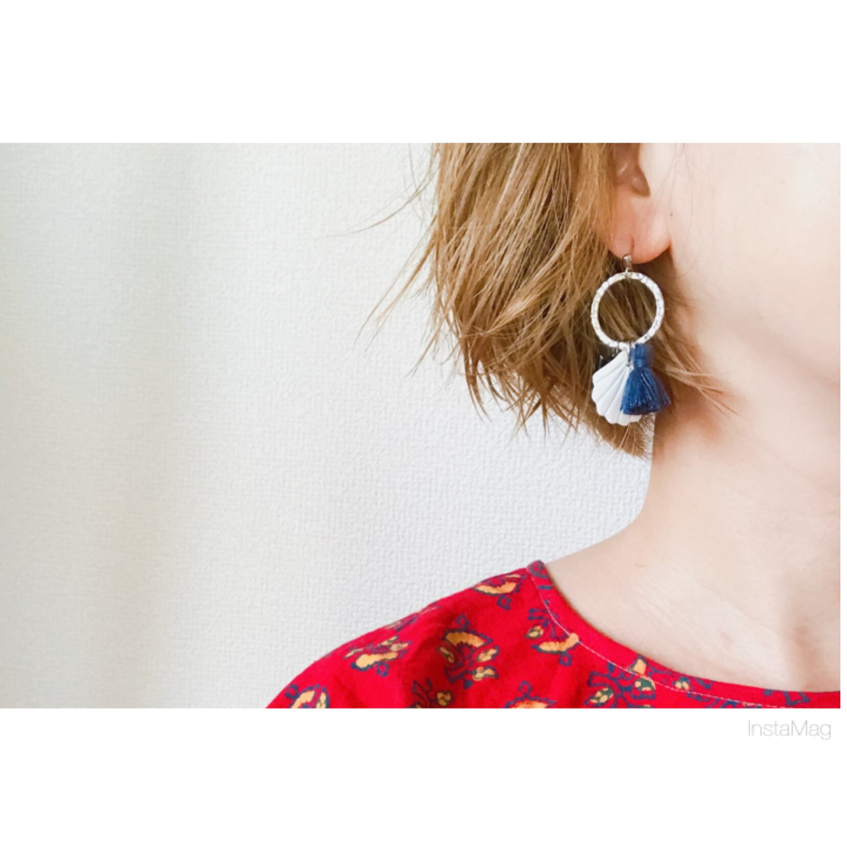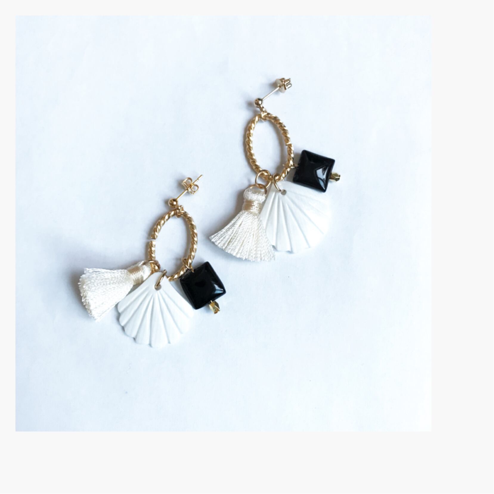 太めリングに真っ白なシェルと色が綺麗なタッセル、スクエア形のオニキスを合わせたピアス、イヤリングです。