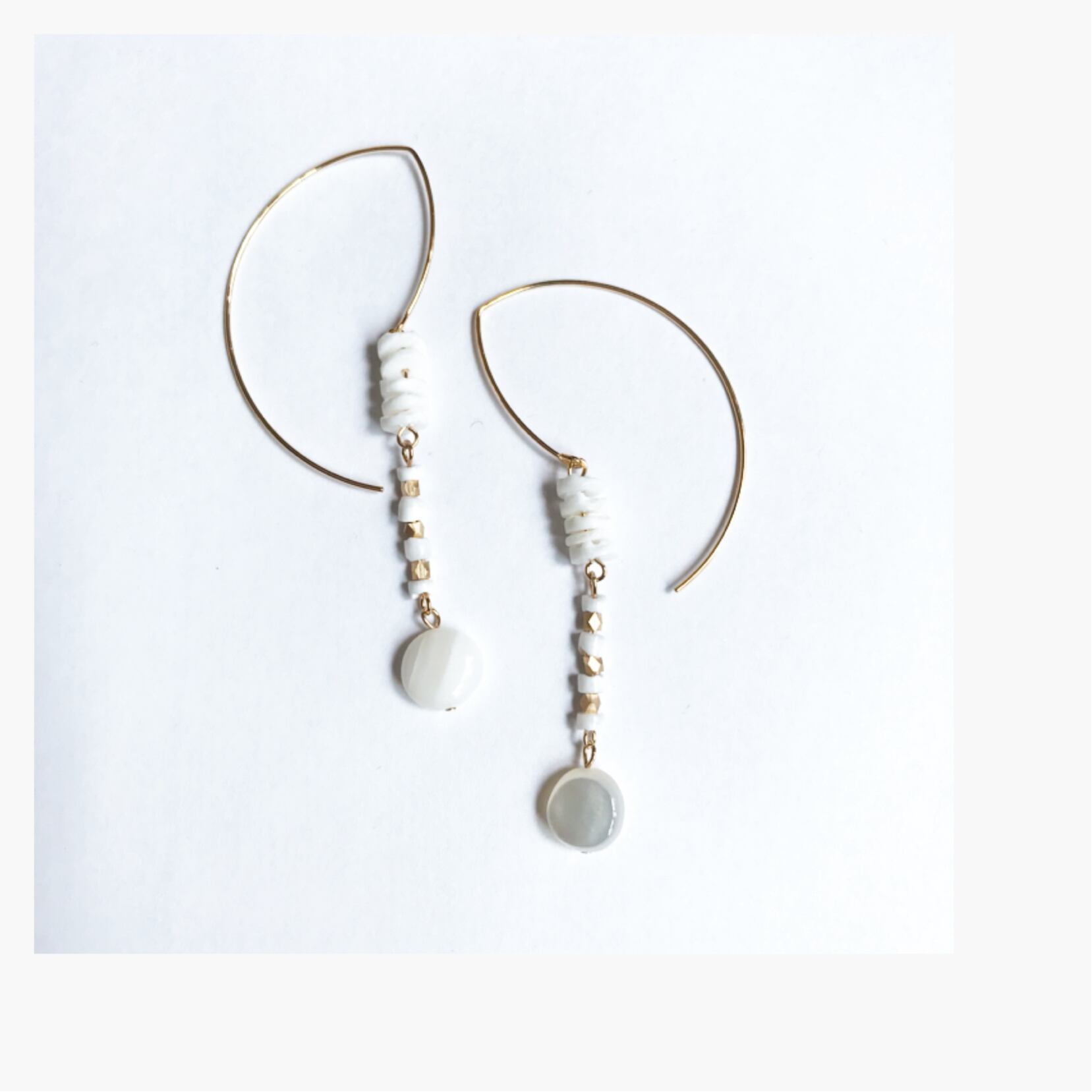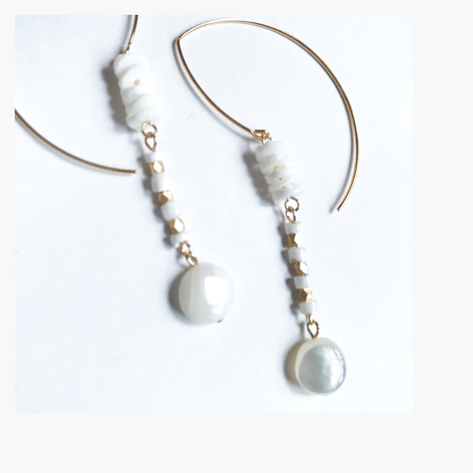 ホワイトシェルとゴールドビーズのシンプルで可愛らしい、ちょっとボヘミアン感漂うピアスです。