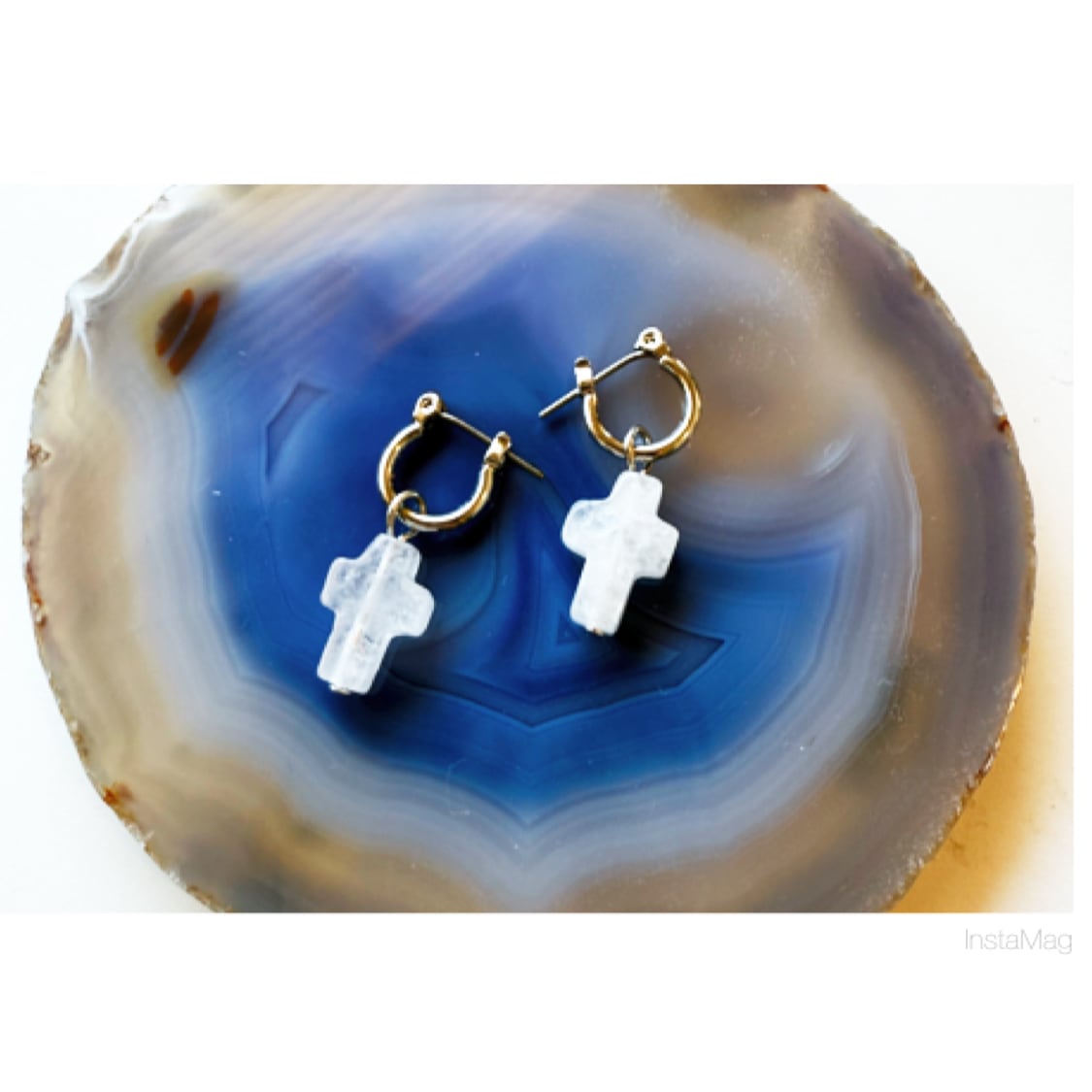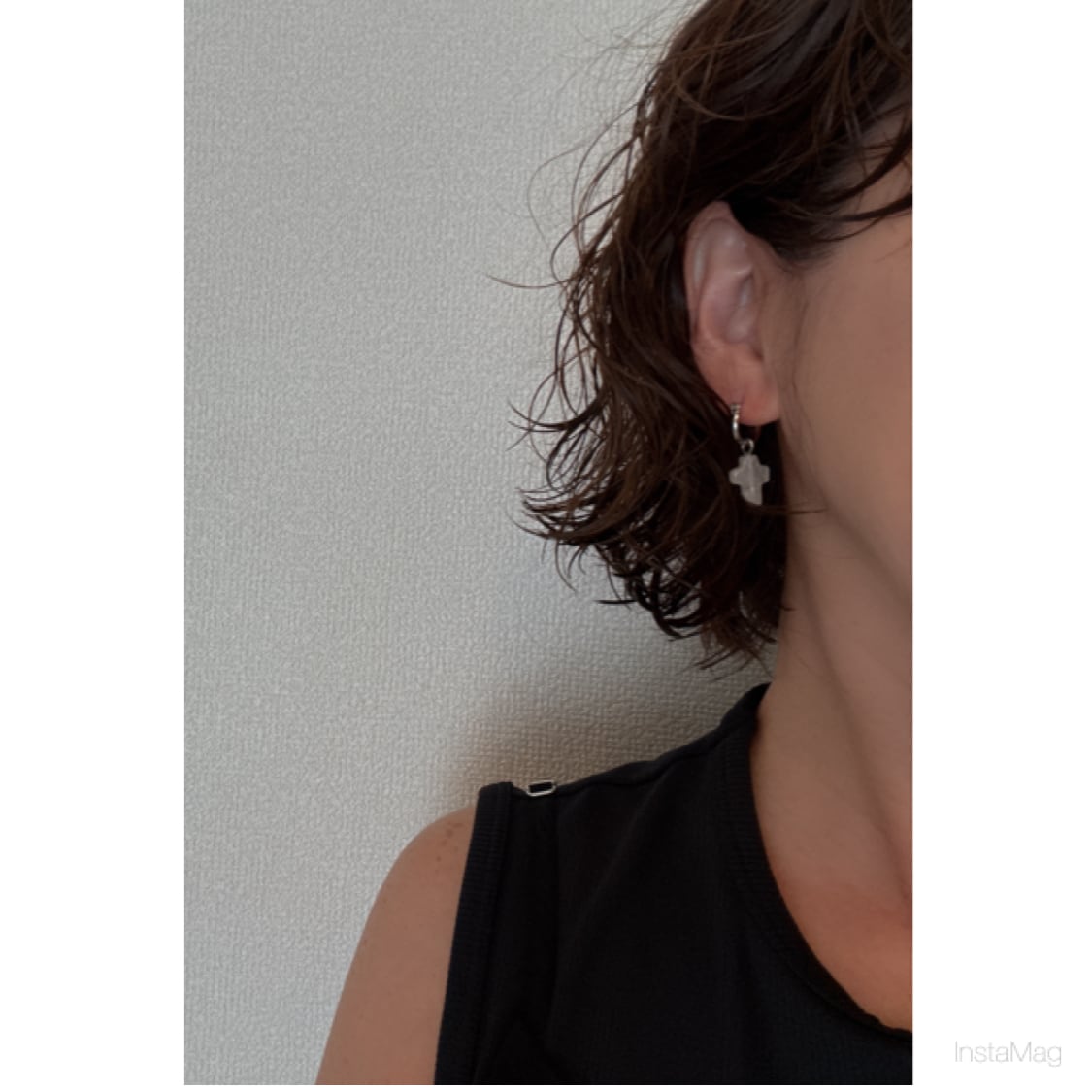 クリスタルの小さめなクロスに小さなシルバーフープピアス。