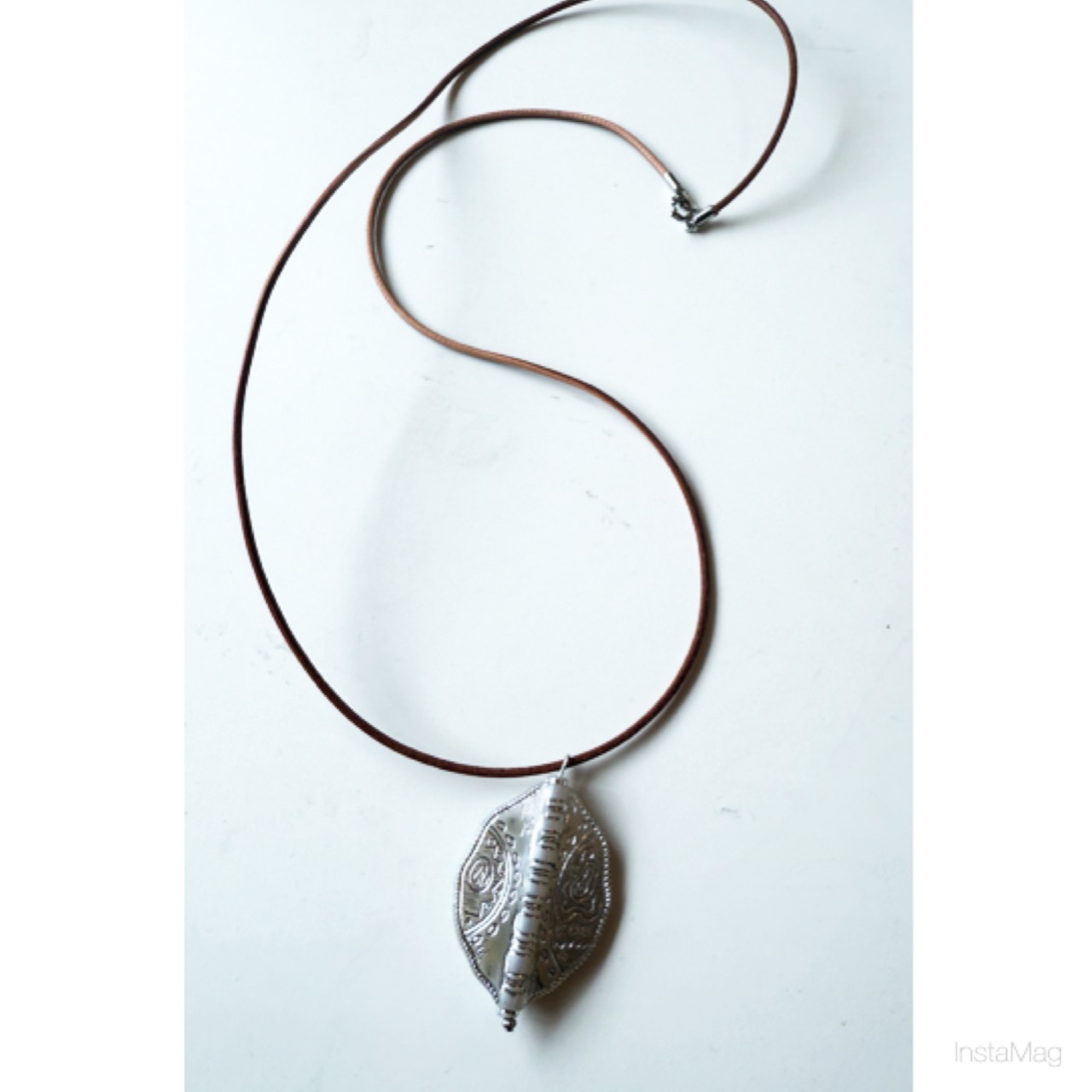 ネイティブ感ある模様の入ったリーフ形の革紐ネックレス。