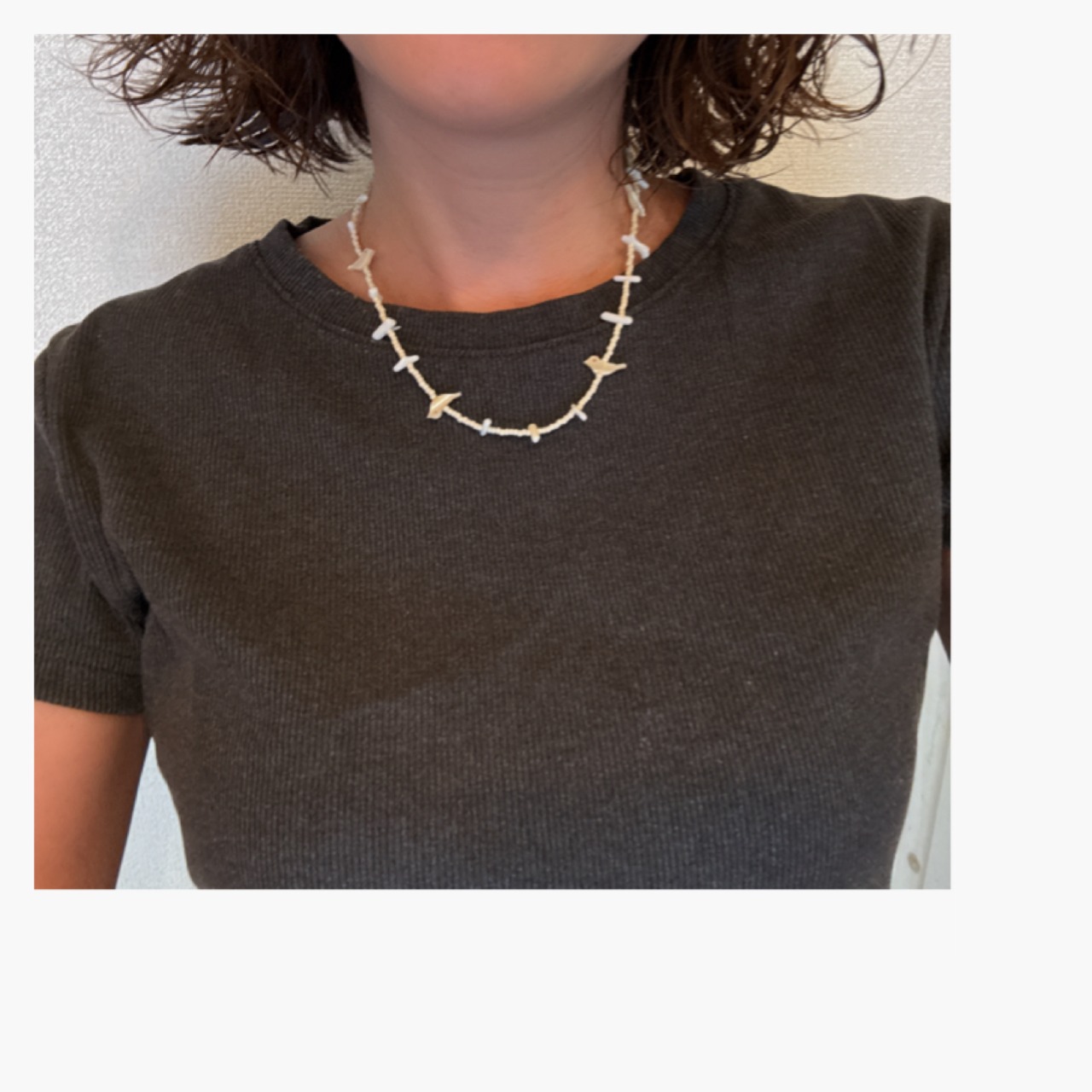 ナチュラルカラーで作った短めのネックレス。 重ね付けもおすすめです! ✴︎サイズ 長さ約43.5㎝ ✴︎素材 シェル、アクリル、メッキ