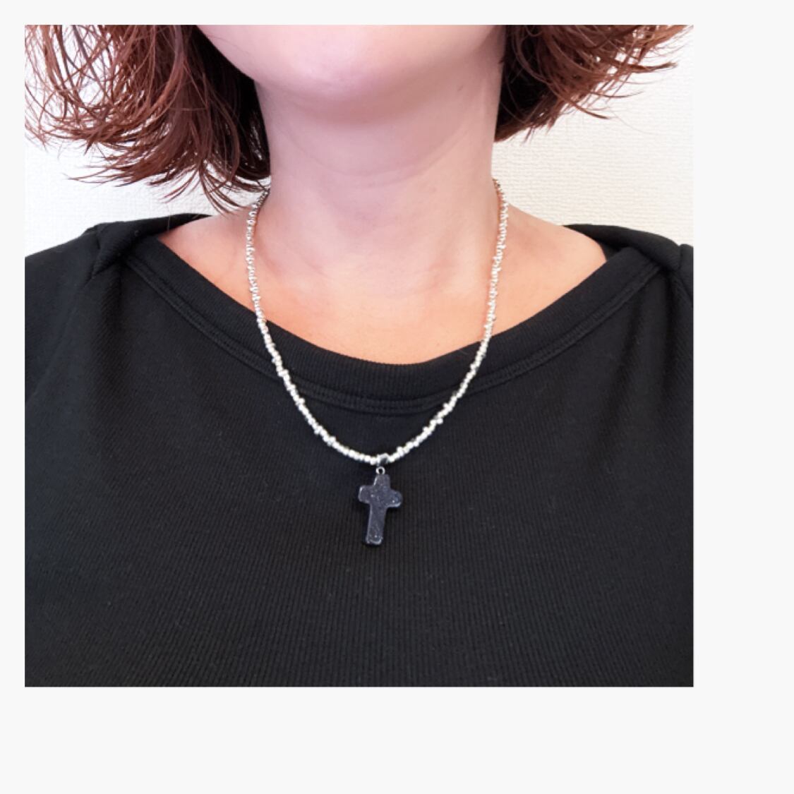 ラピスラズリのクロスのネックレスです。 合わせやすい短めタイプです! ✴︎サイズ 長さ約41〜46㎝ ✴︎素材 ラピスラズリ、メッキ