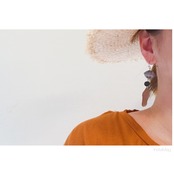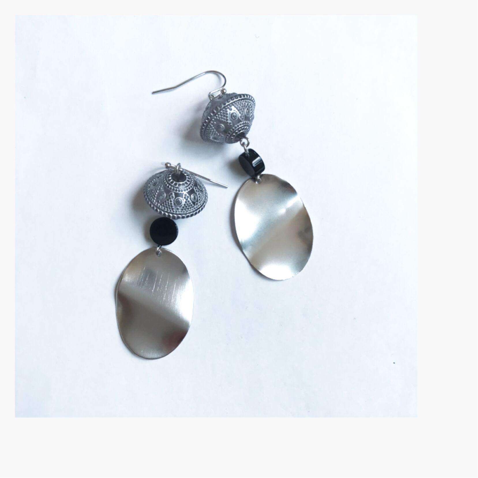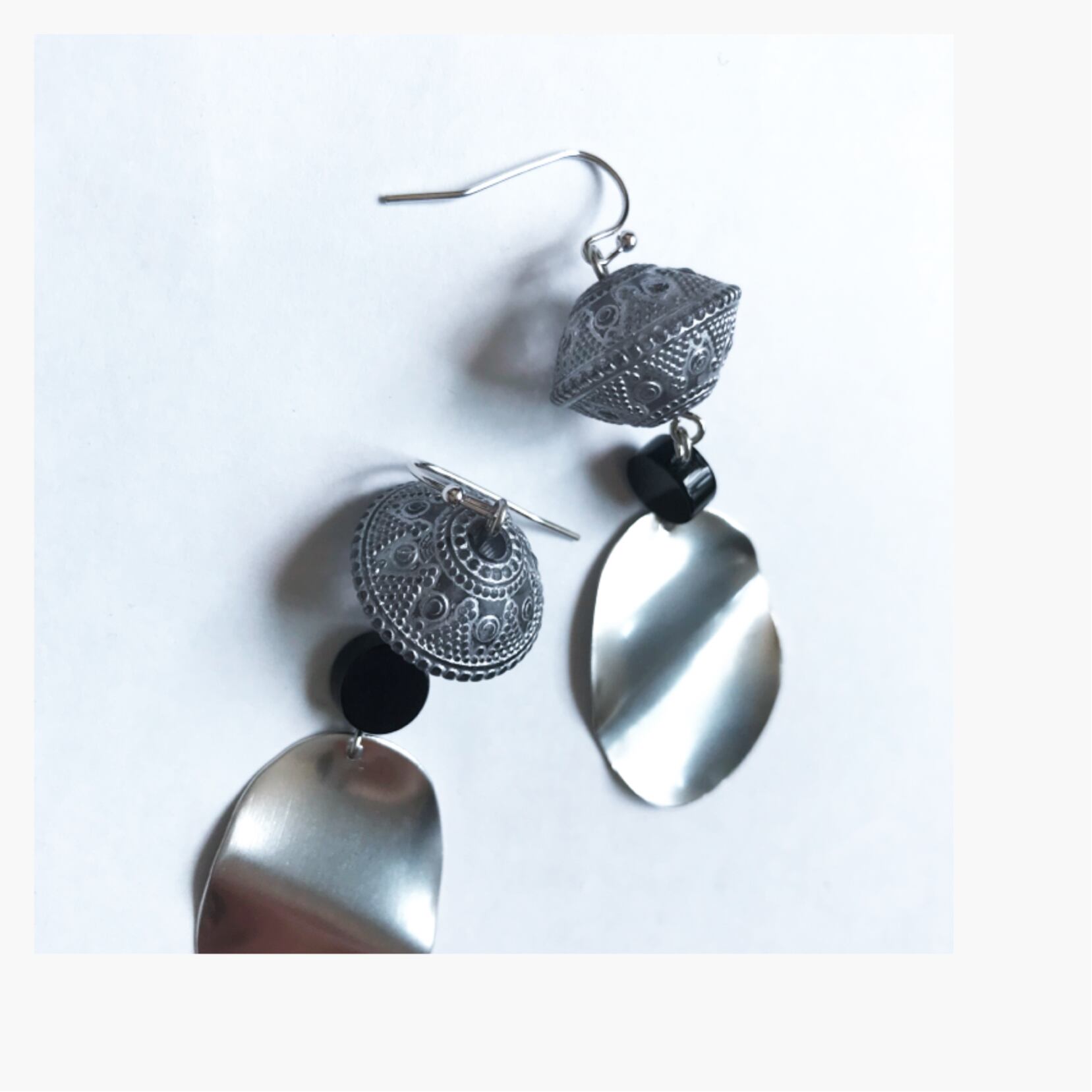アジアン雰囲気漂う彫りの入ったビーズにオニキス、少し大振りなうねりのあるシルバープレートを合わせたピアス、イヤリングです。