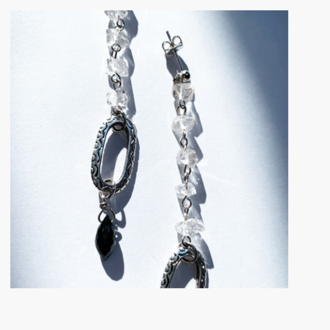 キラキラのクリスタルを並べて、カットの綺麗なオニキス、彫りの入ったシルバーパーツのラインピアス、イヤリングです。