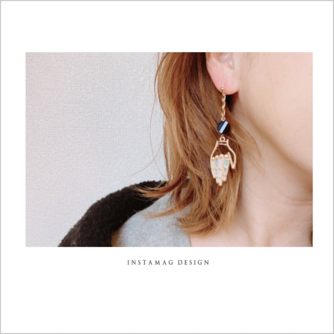 薄いブルーとホワイトのハンドモチーフのパーツをメインに遊びゴゴロ溢れる少し大振りなピアス、イヤリングです。