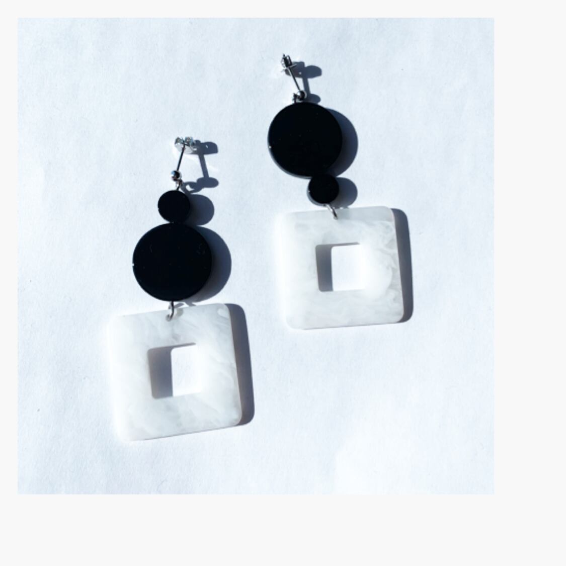 大振りなアクリル素材のホワイトパーツにコイン形のオニキスを合わせたモノトーンでアシメントリーデザインのピアス、イヤリングです。