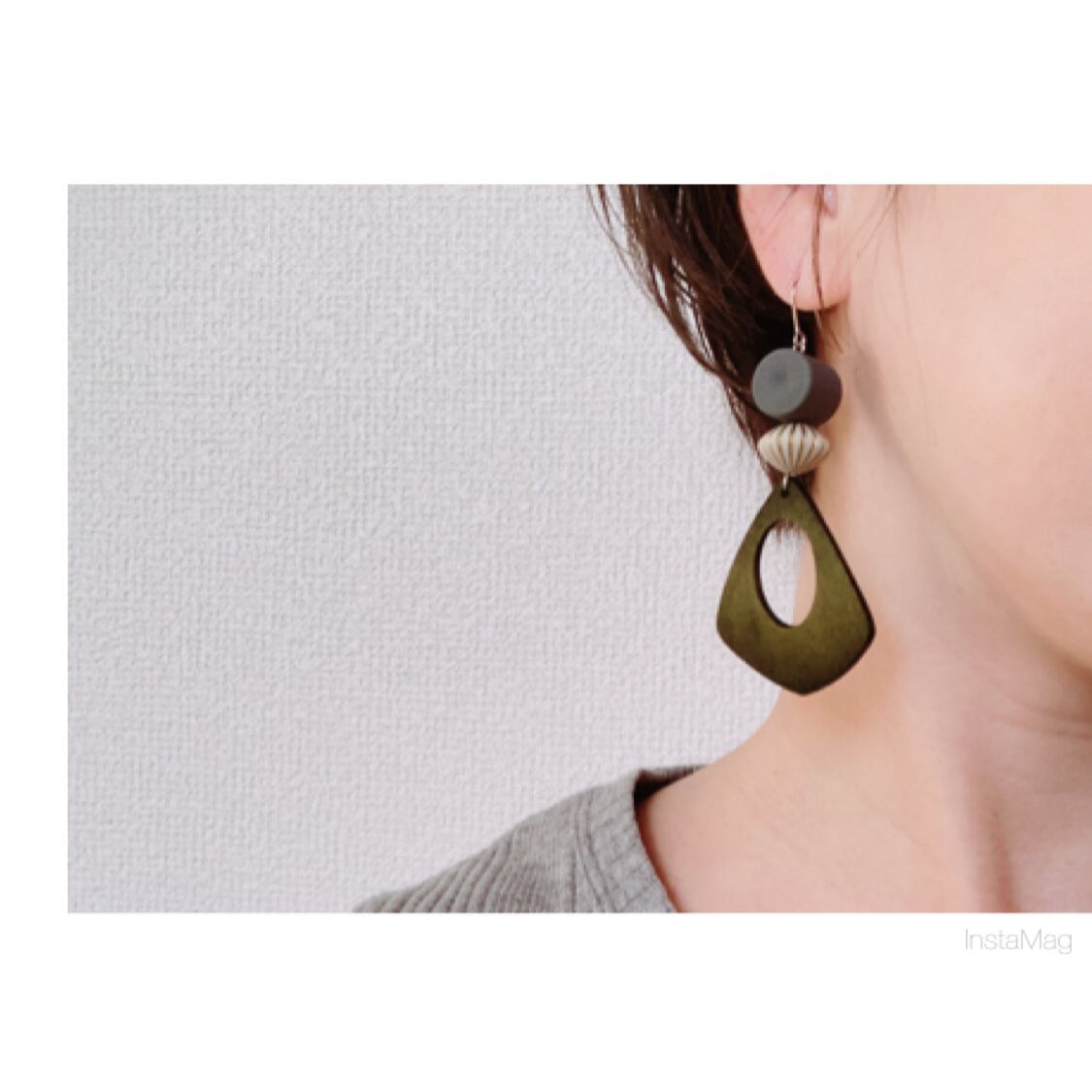 大振りなカーキかグレーのウッドパーツに彫りの入ったビーズとグレーゴムビーズを合わせた大振りなピアス、イヤリングです。