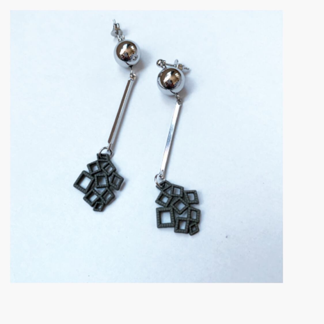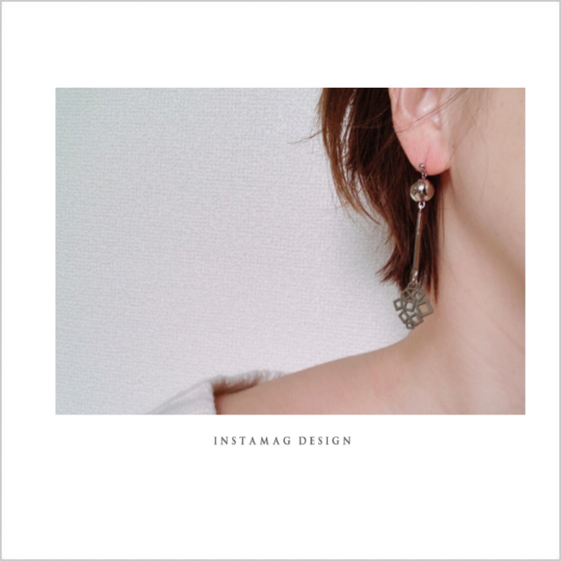 マットグレー色のスクエアの集合体の珍しいパーツをメインにグレー×シルバーでシンプルに仕上げたピアス、イヤリングです。