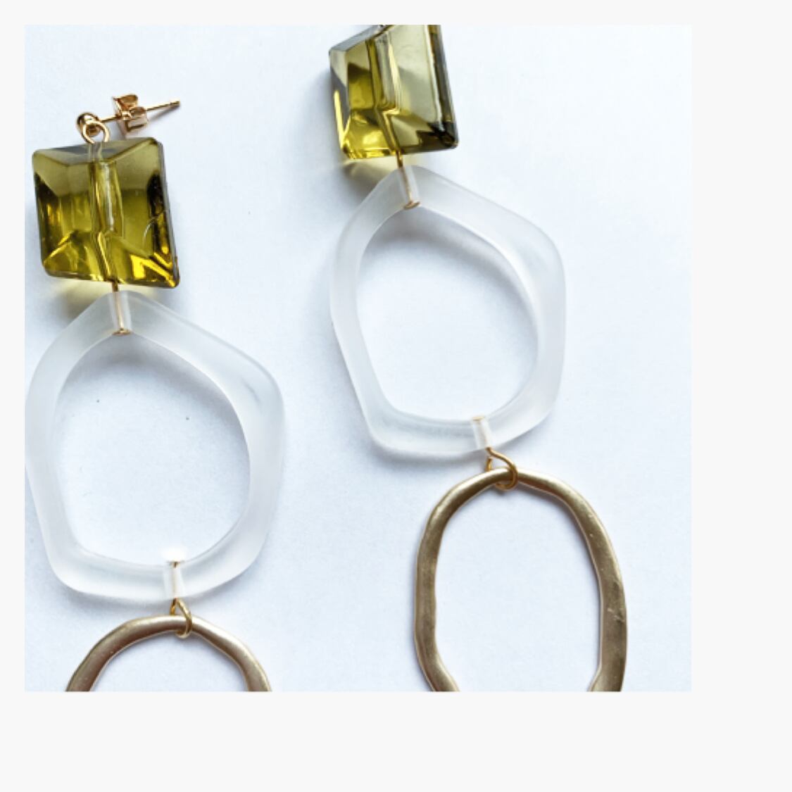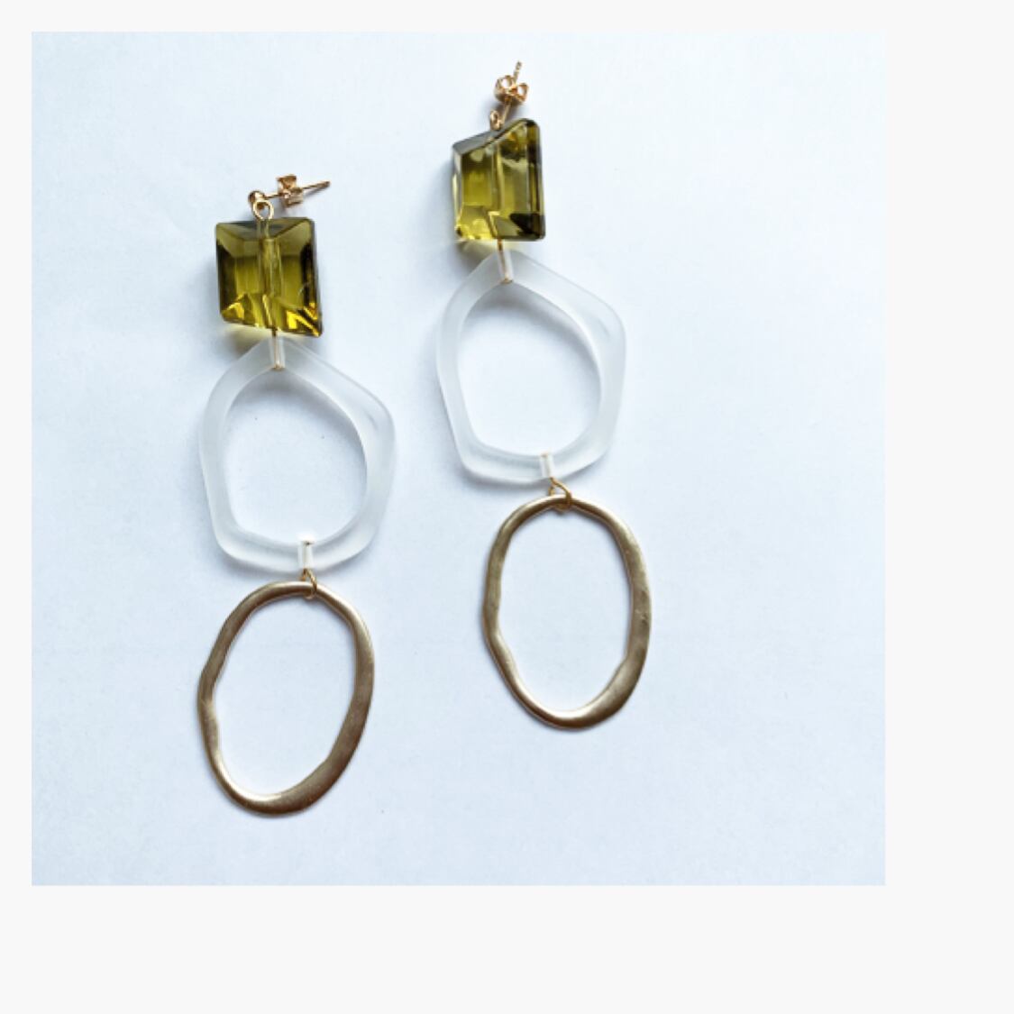 綺麗なクリアなグリーンと半透明とゴールドのパーツを合わせた大振りなピアス、イヤリングです。