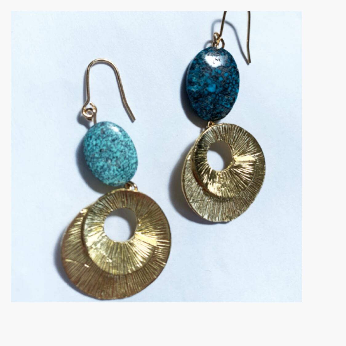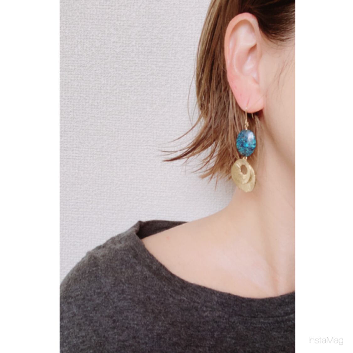 アンティークゴールド色のサークルパーツに左右大きさの違うターコイズを合わせたピアス、イヤリングです。