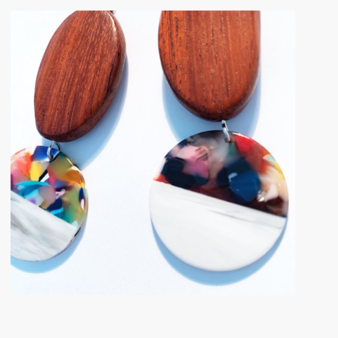 大振りのウッドとアセチルセルロース素材のカラフルなパーツを合わせた、春夏にぴったりのピアス、イヤリングです。