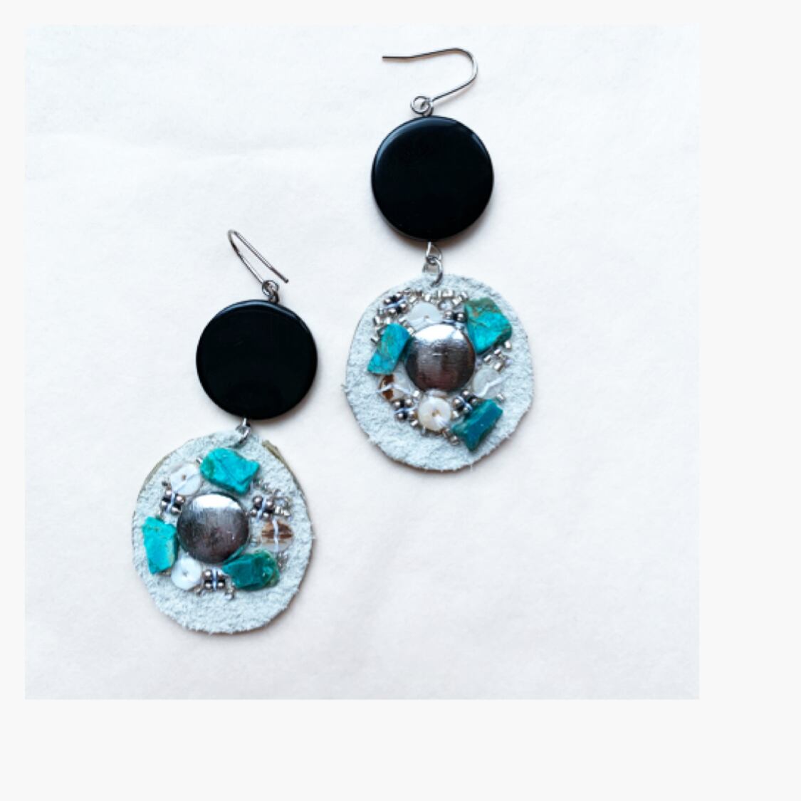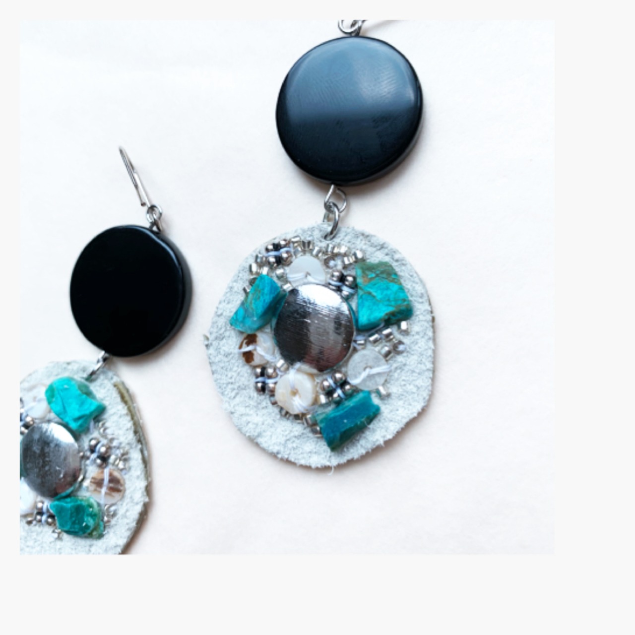 本革にシェル、メタルビーズ、クリソコラをふんだんに縫い付けて仕上げた、一点物のピアス、イヤリングです。