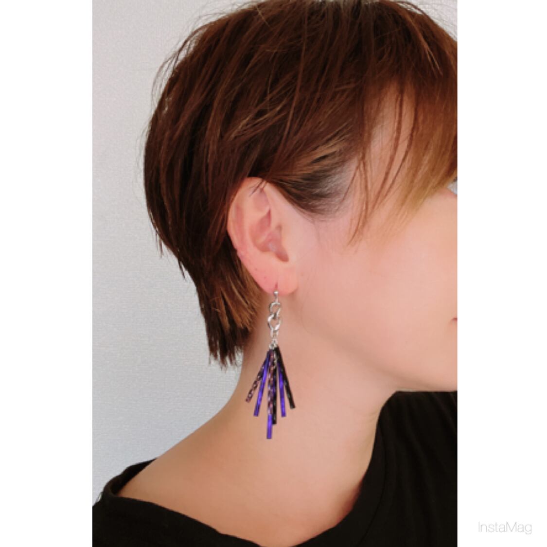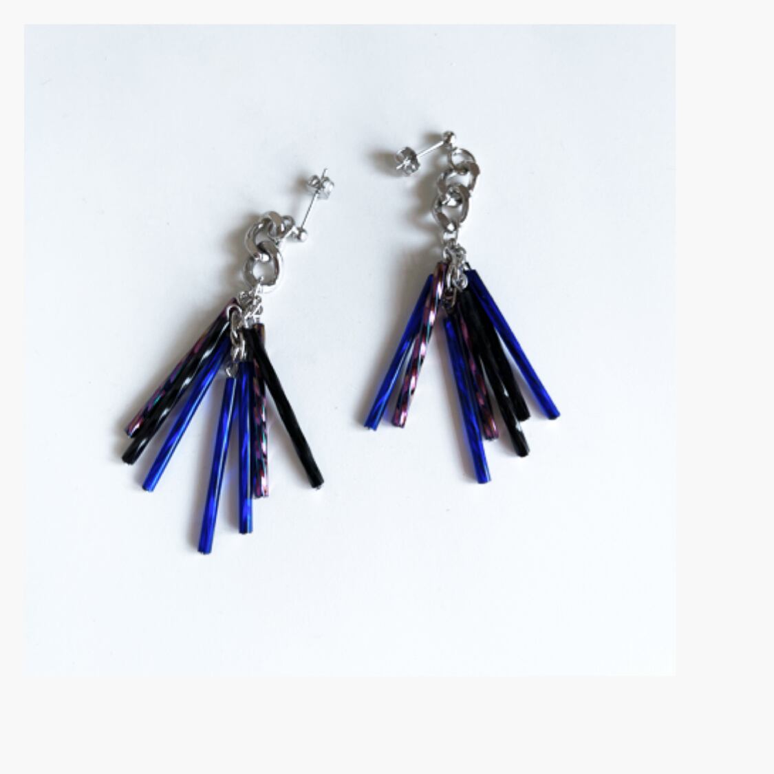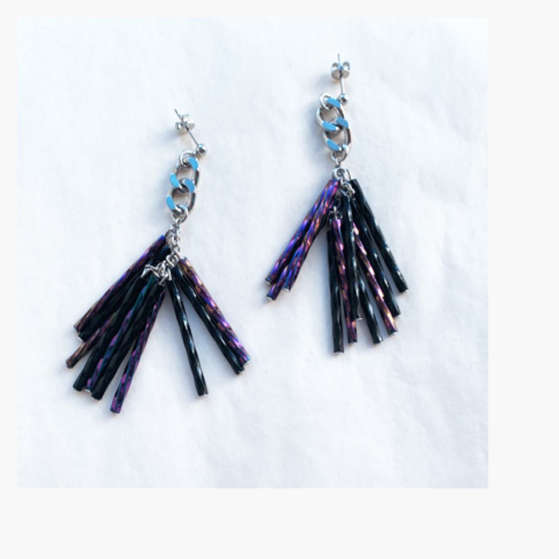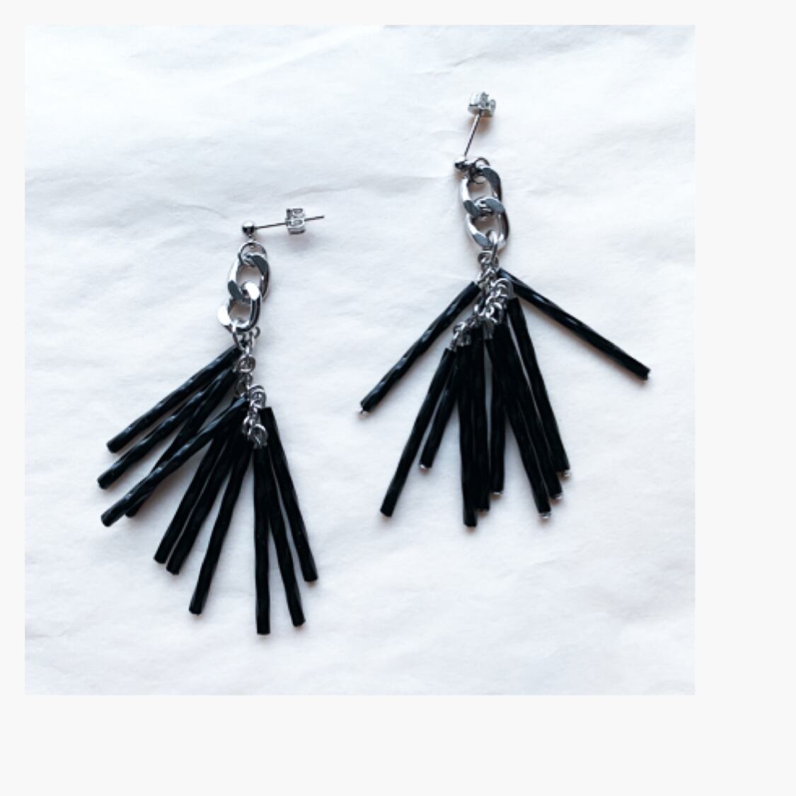 黒の長めのガラスビーズをフリンジデザインにした個性派なピアス、イヤリングです。