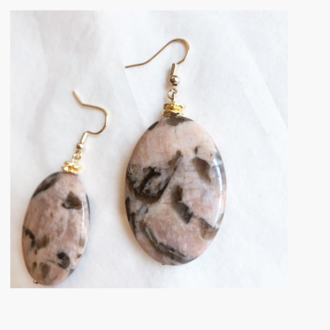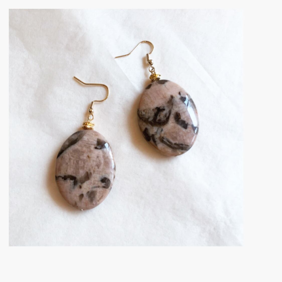 ベージュベースの優しい色味のフェルスパスをメインにしたピアス、イヤリングです。