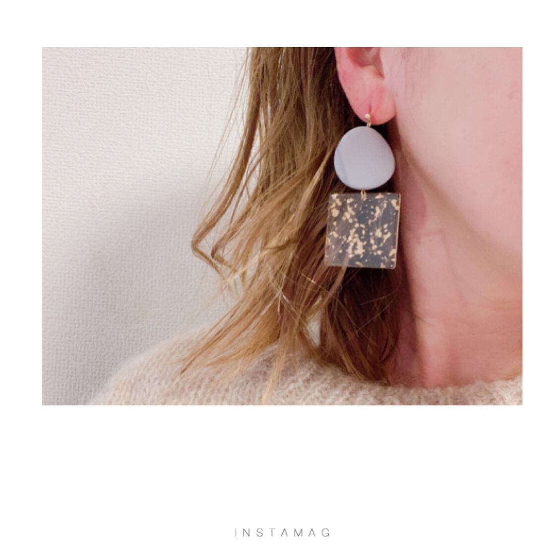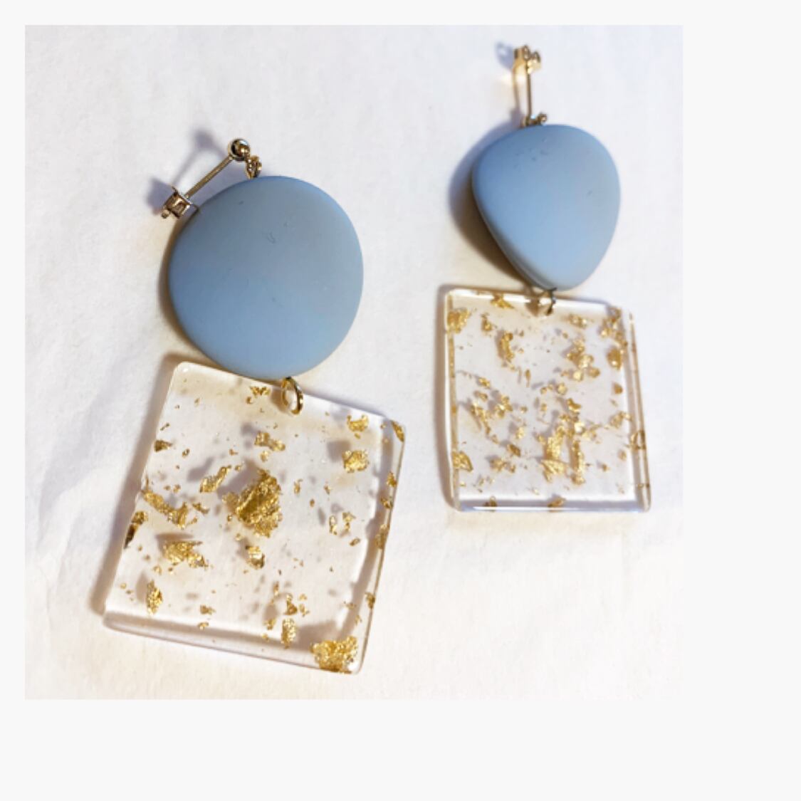 優しい色のライトベージュとクリアにゴールドが散りばめられたスクエアパーツを合わせた大振りなピアス、イヤリングです。