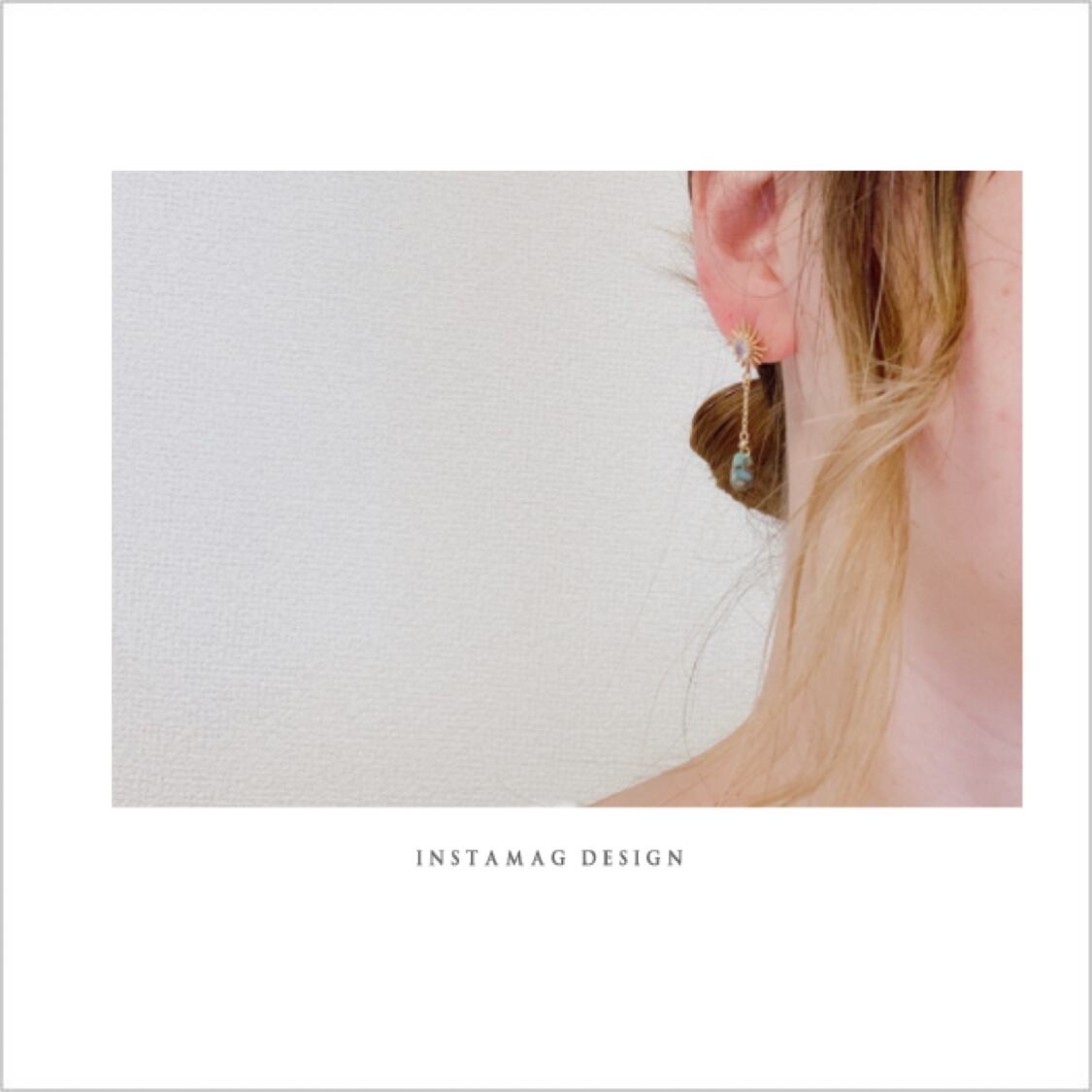 太陽モチーフにコッパーアマゾナイトを垂らした可愛らしいサイズのピアスです。