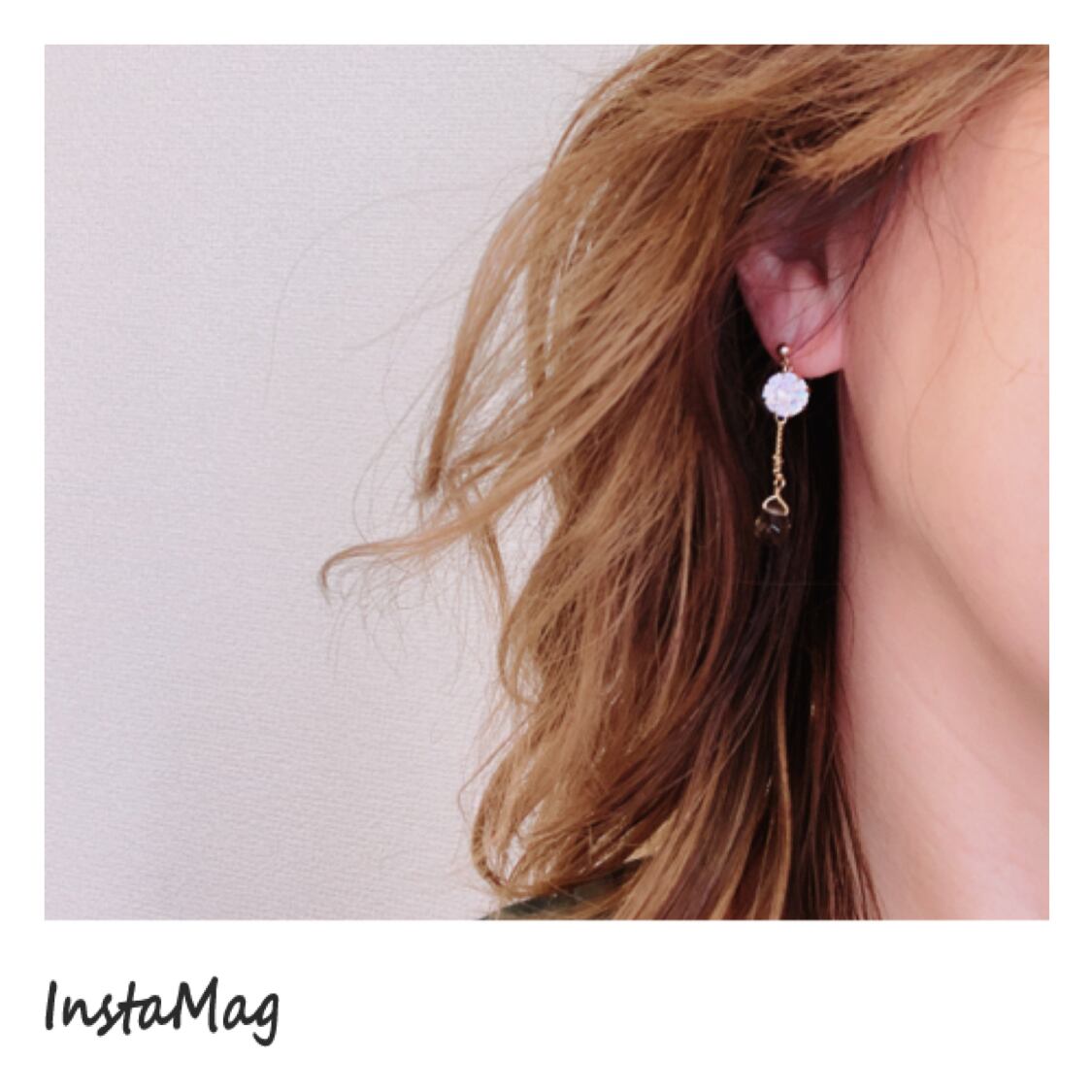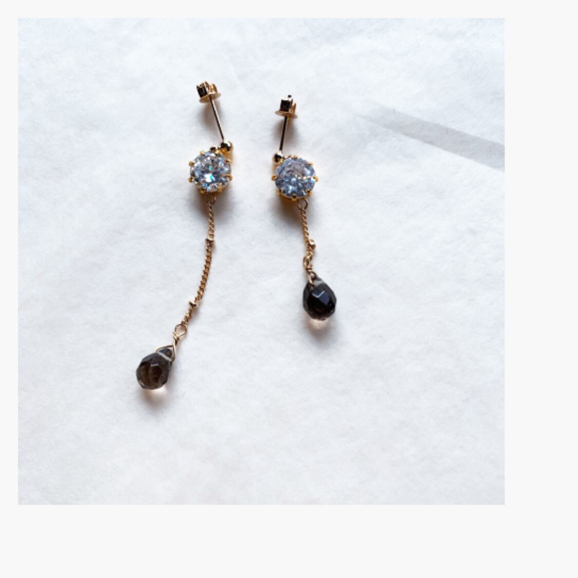 キラキラなジルコニアに左右長さが異なる飾りチェーンにスモーキークォーツを垂らした、シンプルなデザインのピアス、イヤリングです。