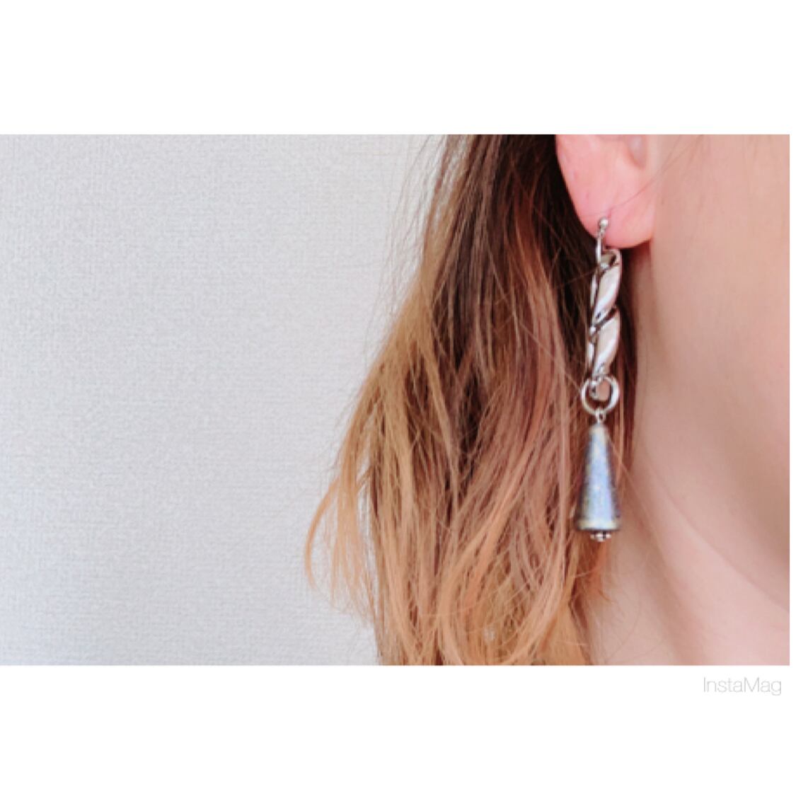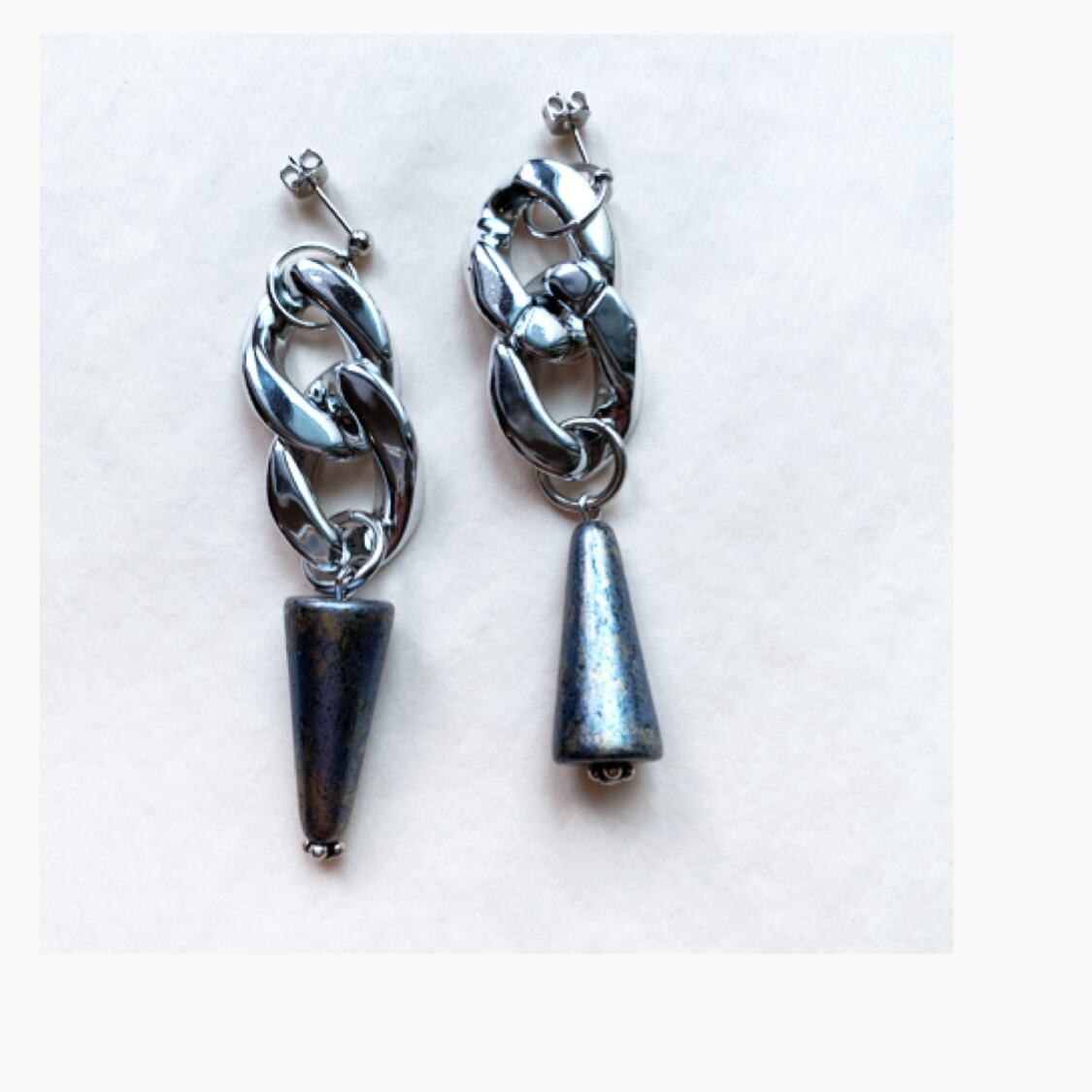 太めのチェーンと珍しいメタリックブルーパーツを合わせたアシメントリーデザインのピアス、イヤリングです。