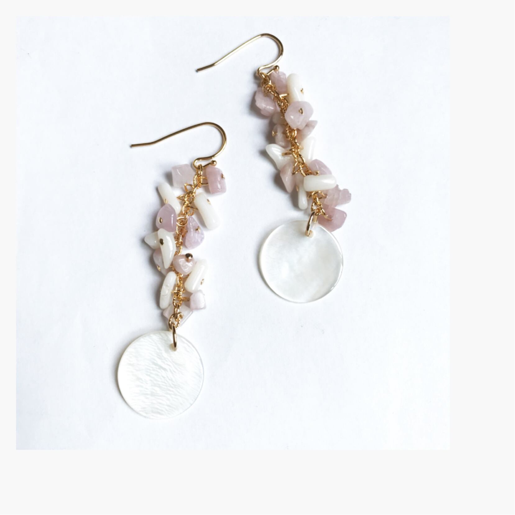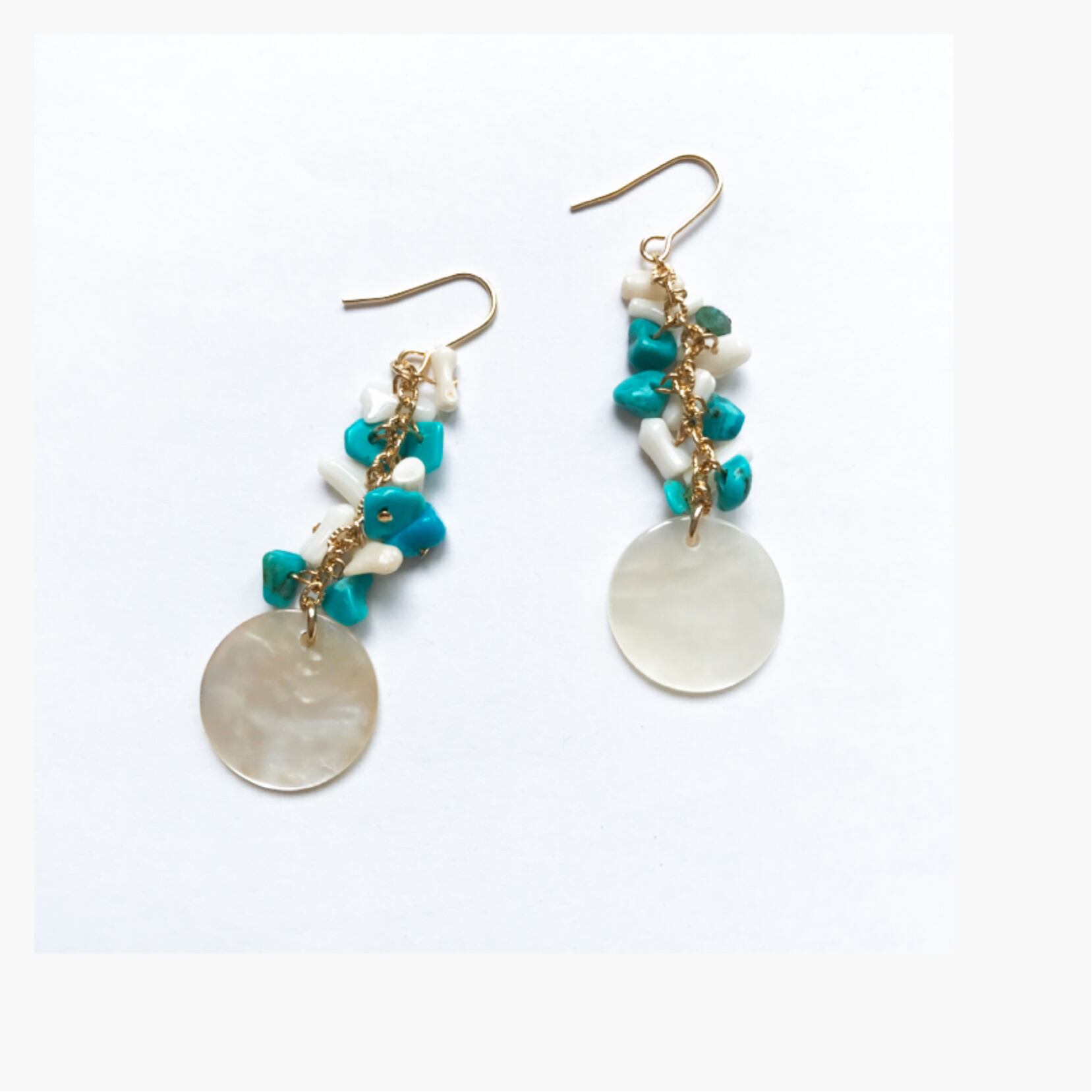 珊瑚のさざれをじゃらっとさせコイン型のシェルで、海を連想させる夏らしいピアス、イヤリングです。
