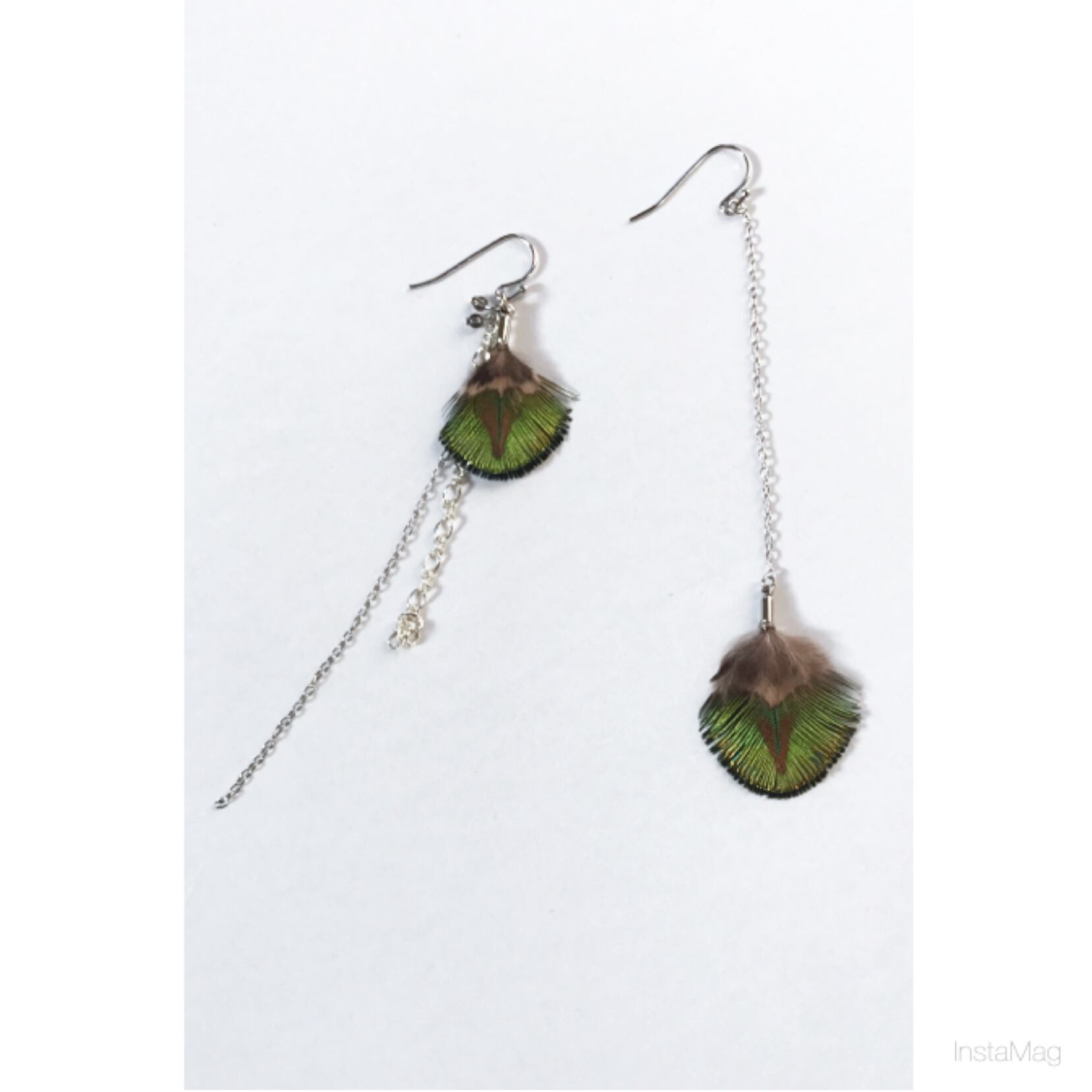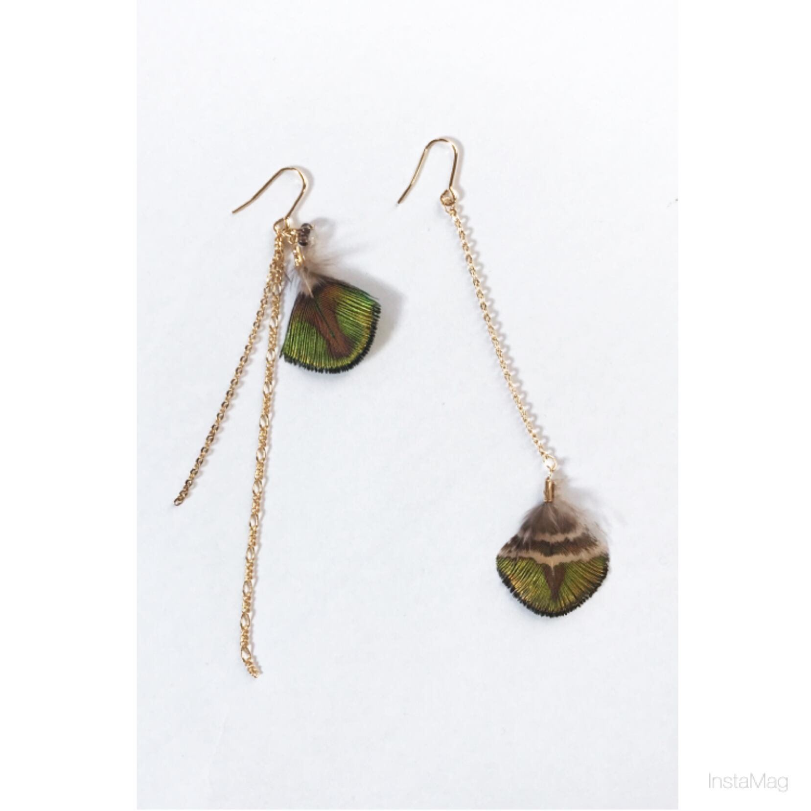 キジのグリーンの綺麗な羽と小さなスモーキークォーツの石でアシメントリーなデザインのピアス、イヤリングです。