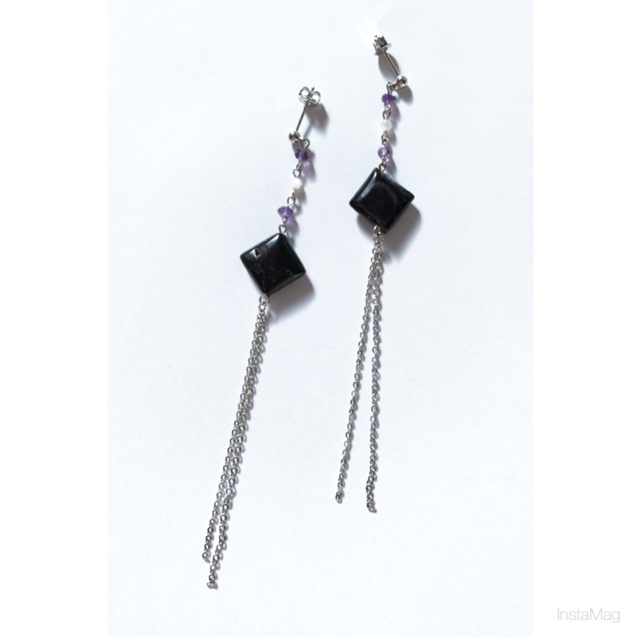 四角オニキスと小さなアメジストとマザーオパールで、シックで大人っぽいピアス、イヤリングです。