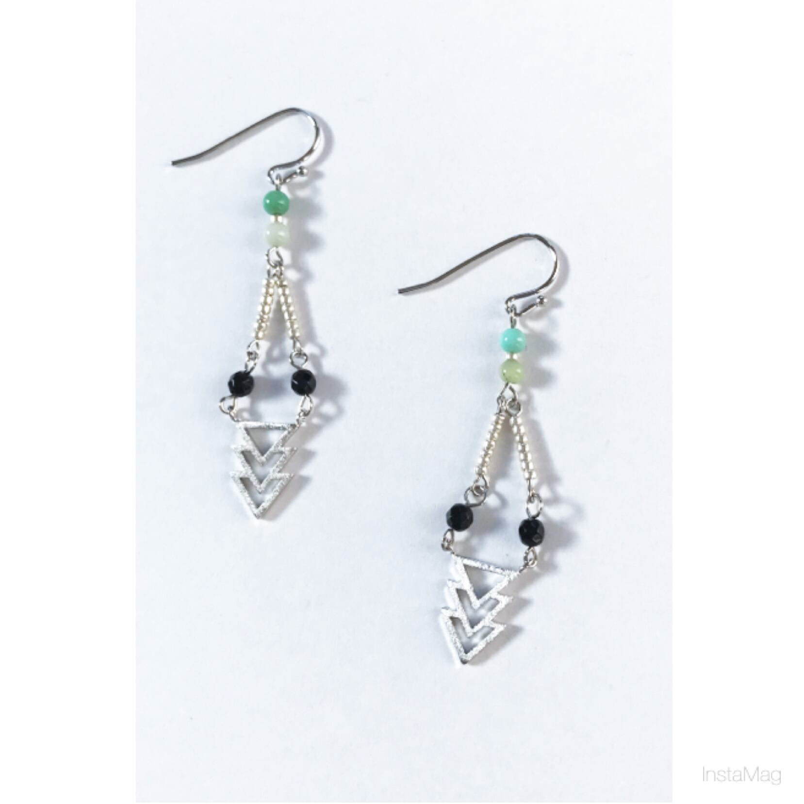 トライアングルのアローパーツとグリーンアゲート、オニキスを使用したボヘミアンなデザインのピアスイヤリングです。