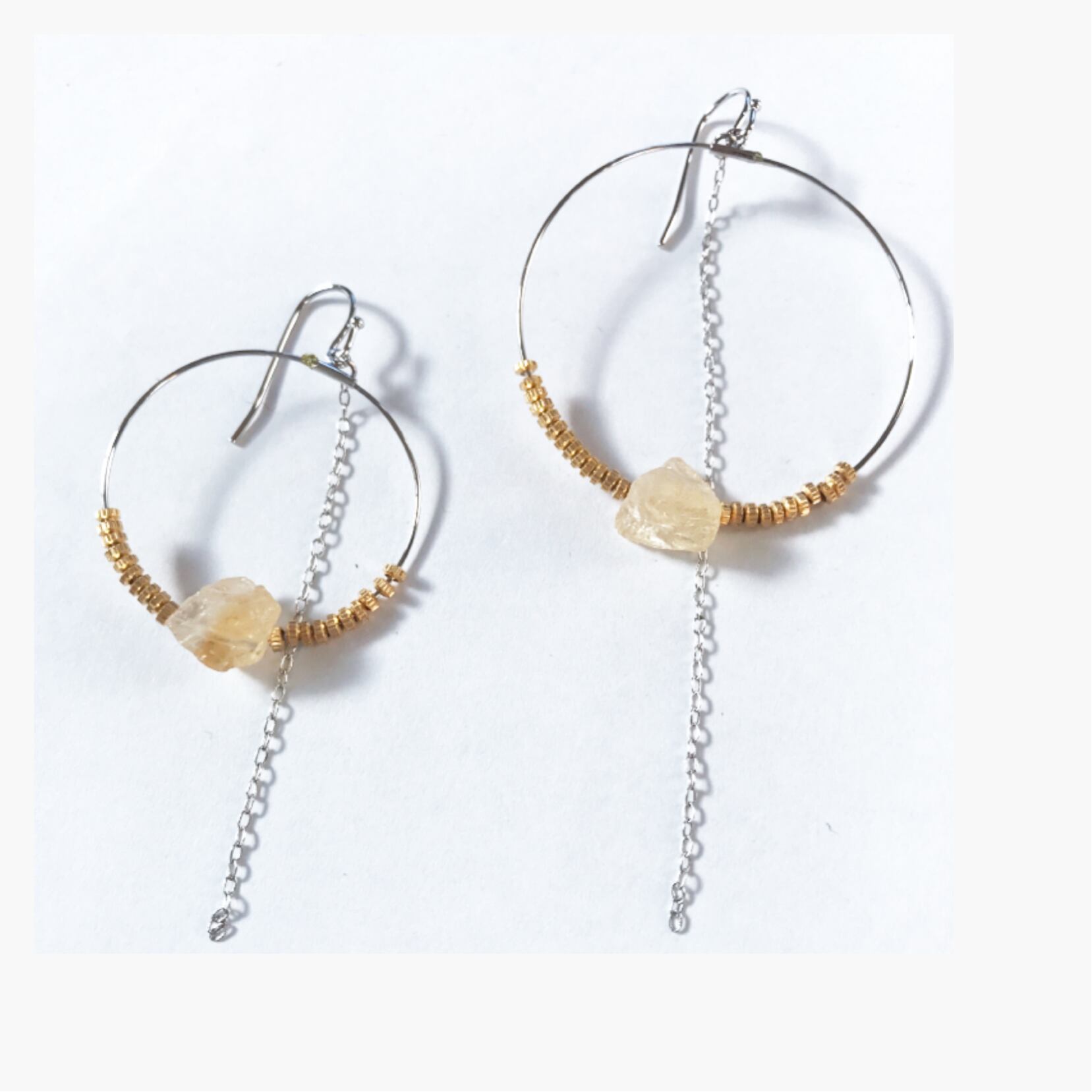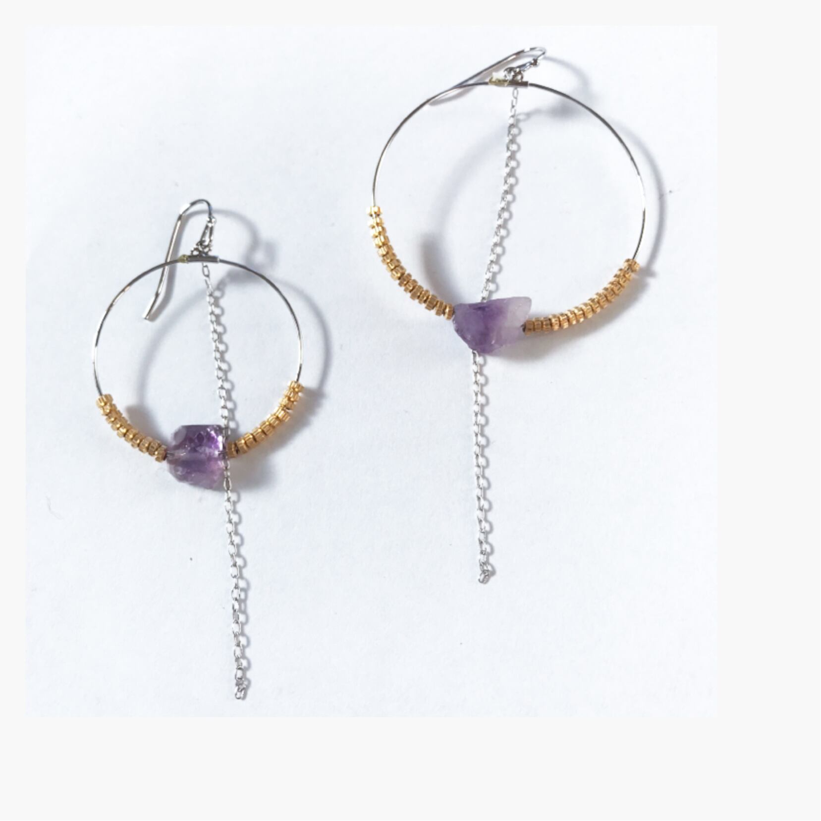 シルバーの左右大きさの違うフープにゴールド&シルバーのミックスデザインのピアス、イヤリングです。