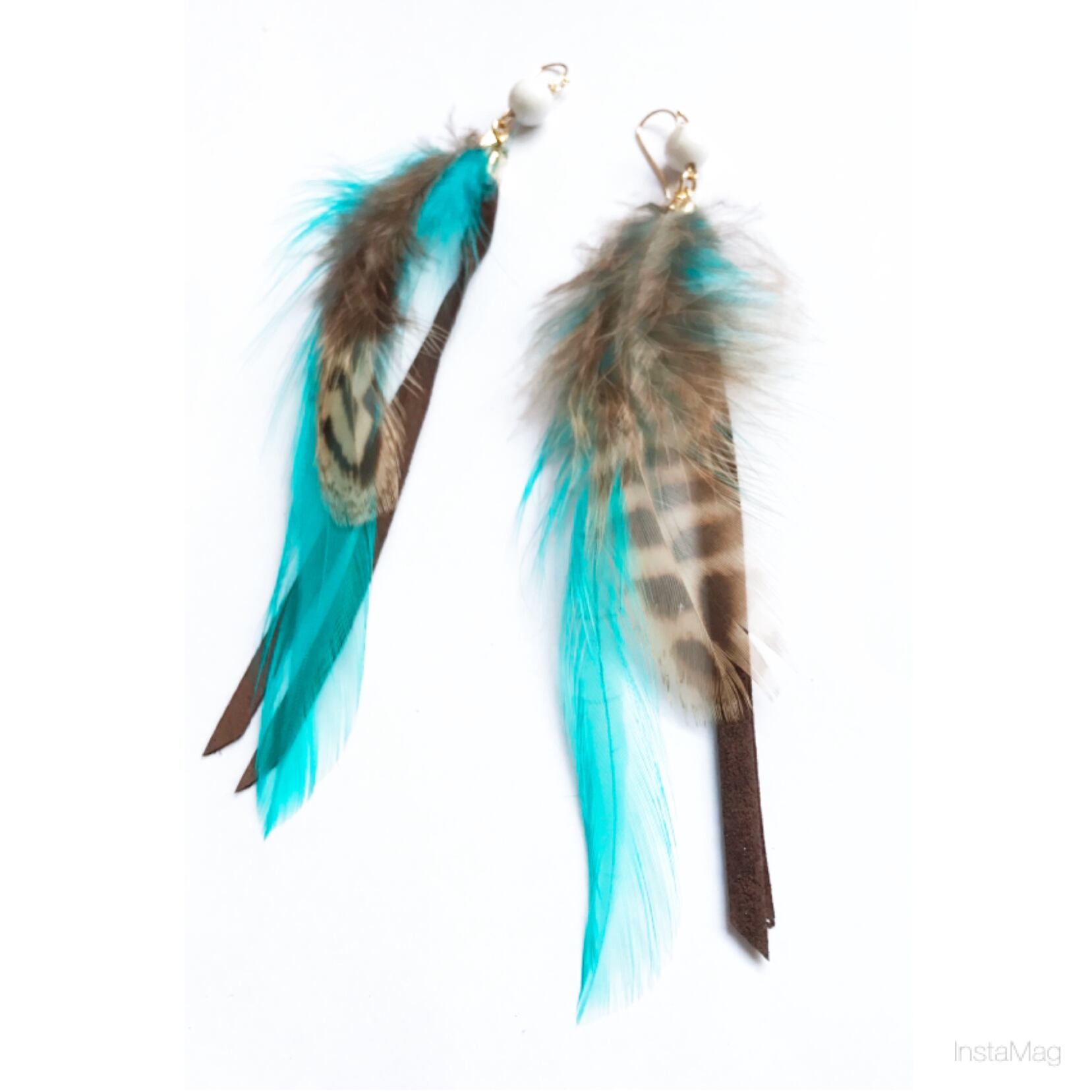 目を惹くターコイズブルーの羽とブラウンの羽を合わせ、ボリュームを出し、ブラウンの本革をアクセントにしたピアス、イヤリングです。