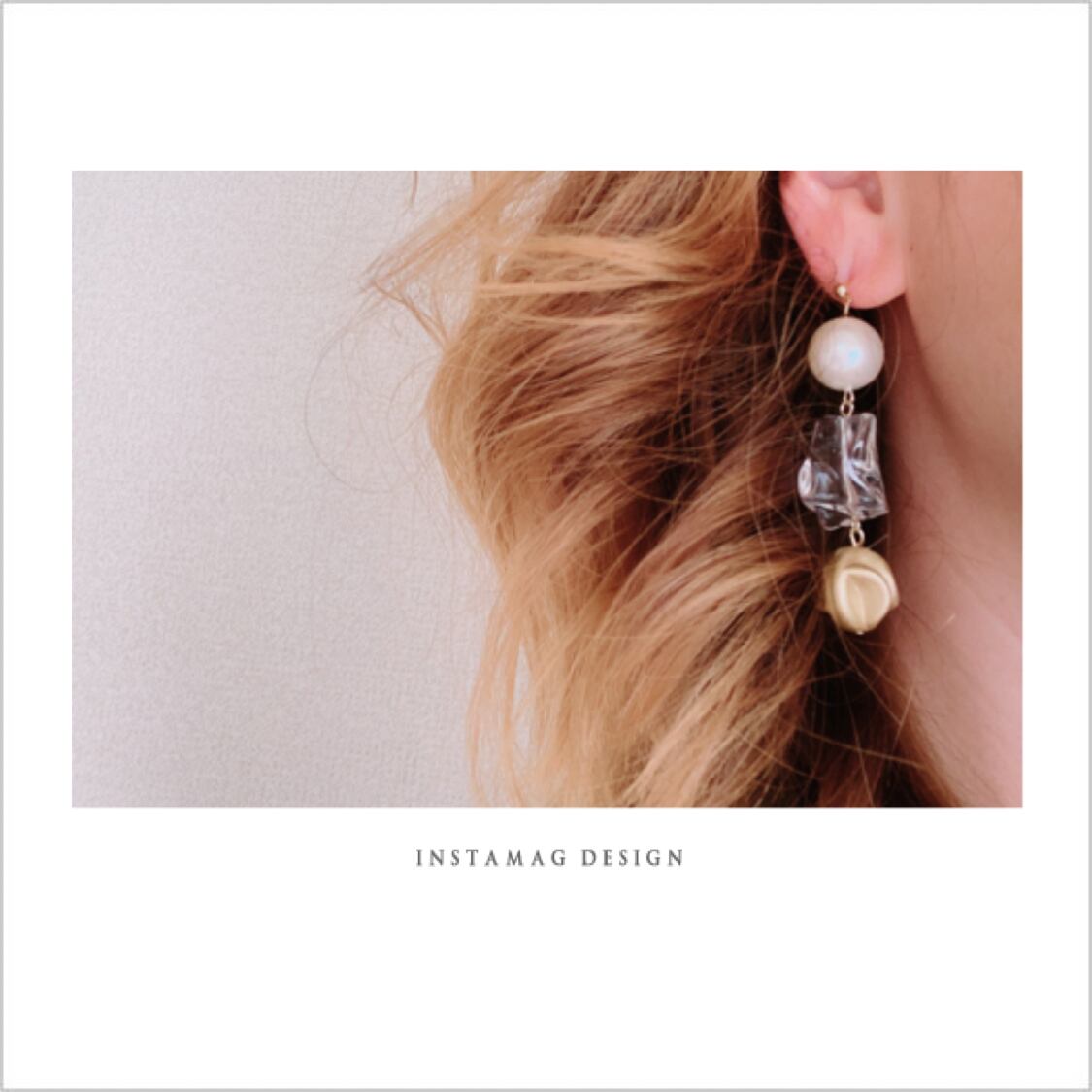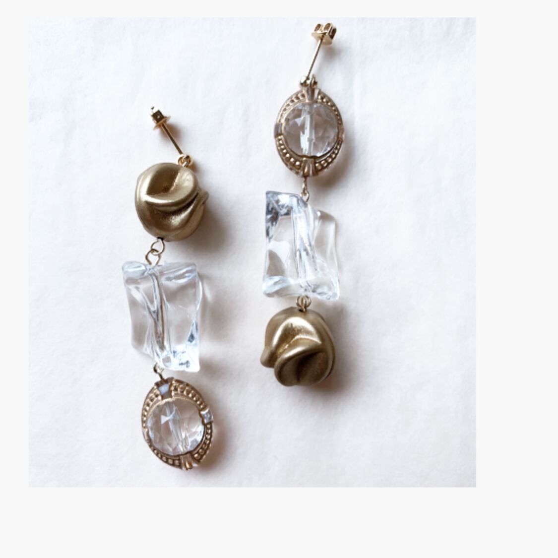 ゴールドとクリアの軽くて着けやすい、アシメントリーデザインのピアス、イヤリングです。