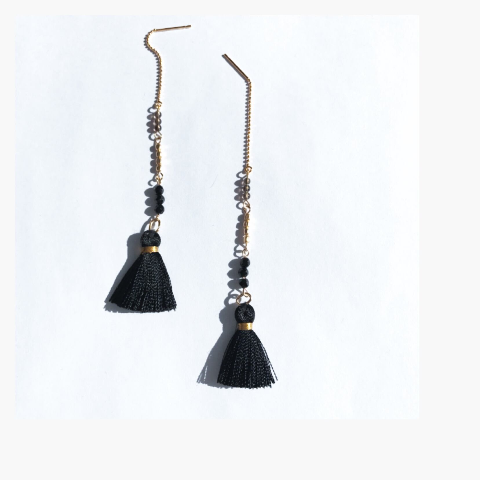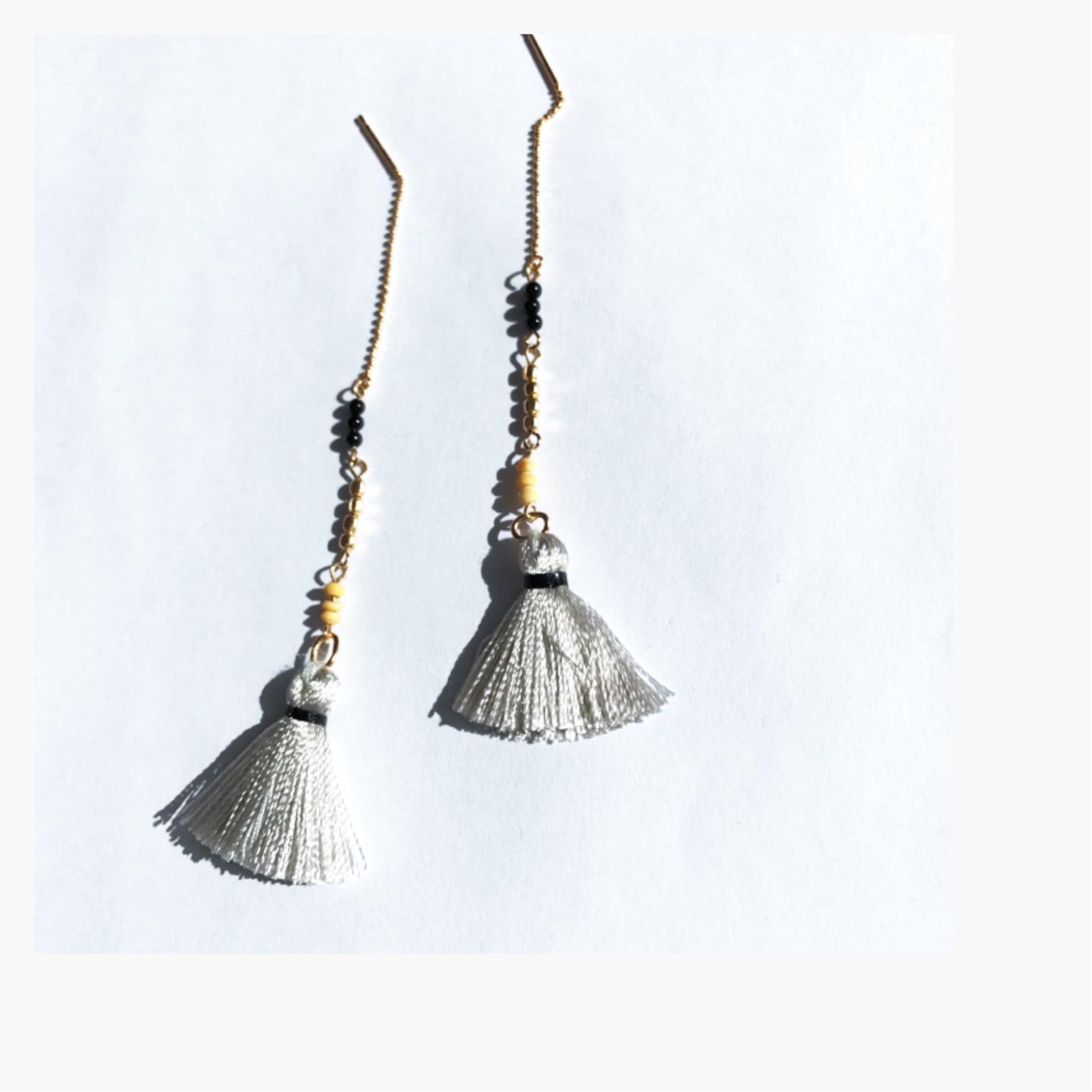 小さな天然石やビーズを繋げ、タッセルを合わせたとっても目を惹くアメリカンピアスです。