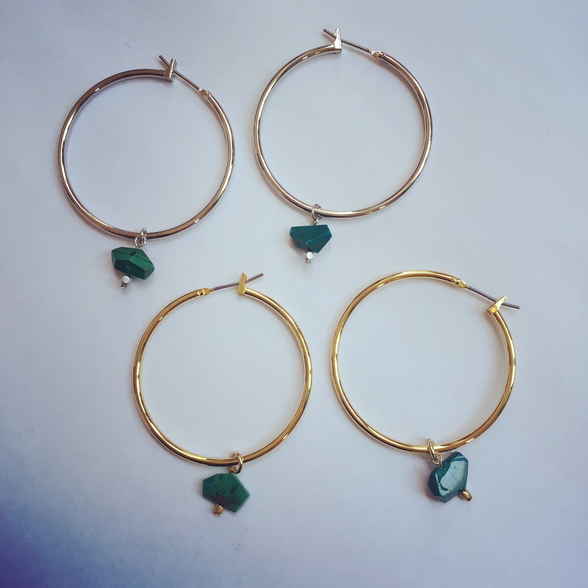 太めのループピアスに天然石のクリソコラを合わせたシンプルなピアスです。