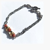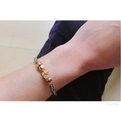 光の反射でキラキラするシャイニーブラウンの天然石とシルバー、ゴールドの少しハードめなミックスデザインのブレスレットです。