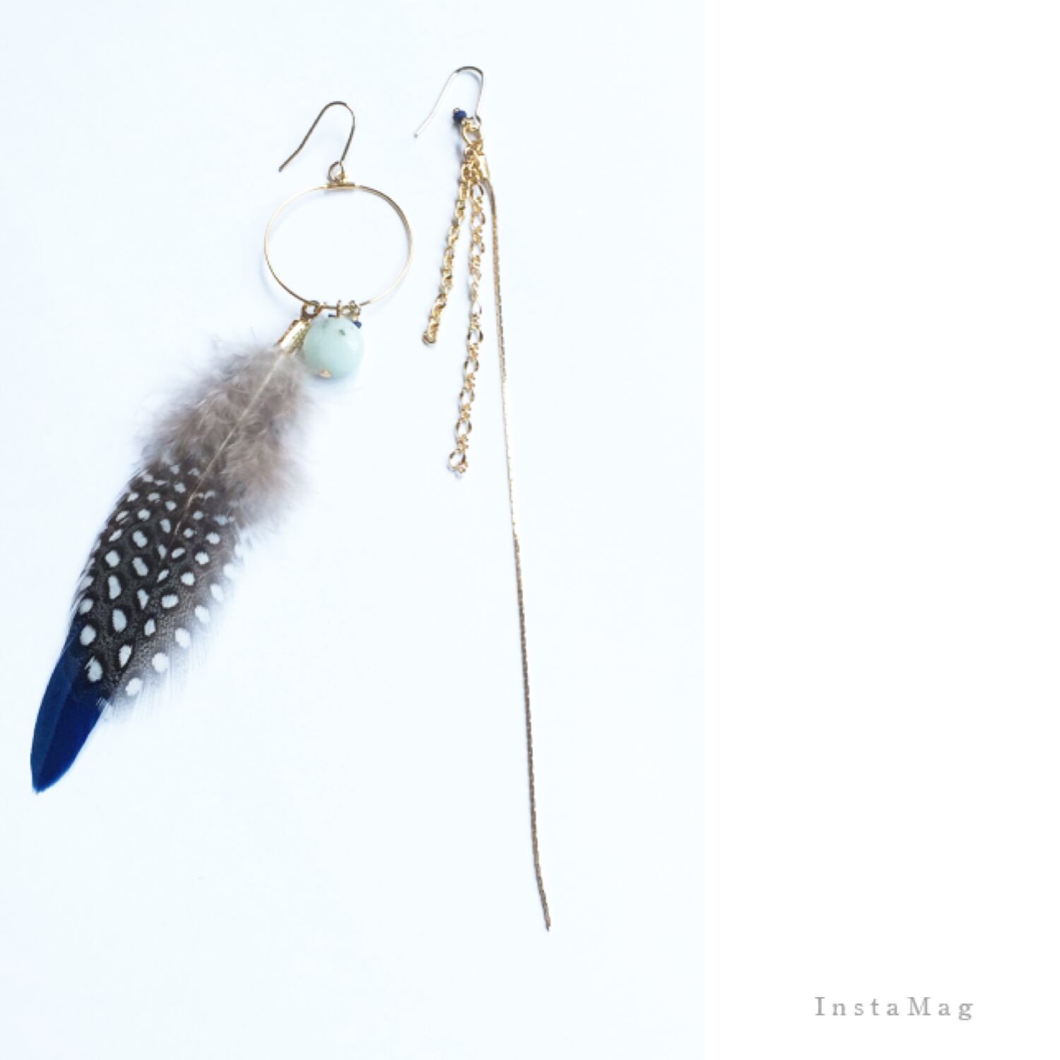 羽、天然石を合わせたアシメントリーデザインのピアスイヤリングです。