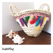 カラフルな羽をメインにデザインした、コロンとしたカゴバッグ。