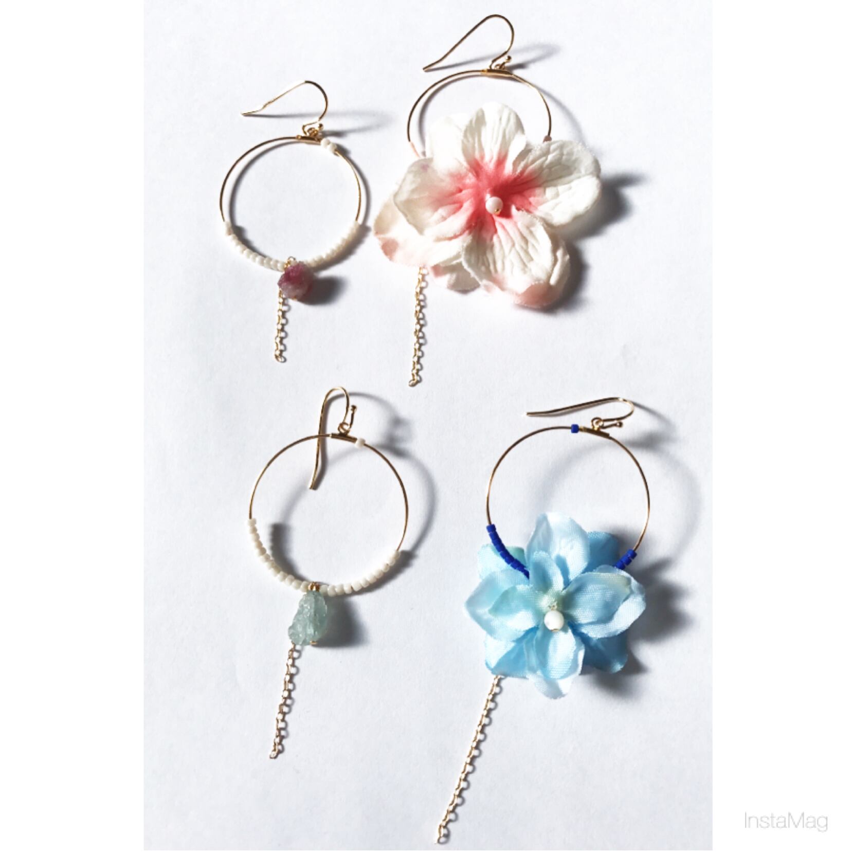 ホワイト系かブルー系のお花と天然石の左右デザインの違うアシメントリーなピアス、イヤリングです。