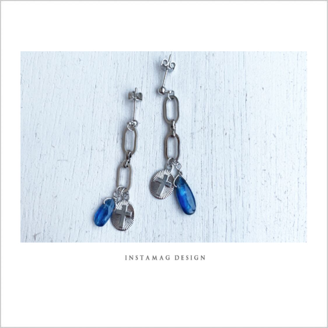 シルバークロスにはカイヤナイトを合わせた、サイズ感も使いやすいピアス、イヤリングです!