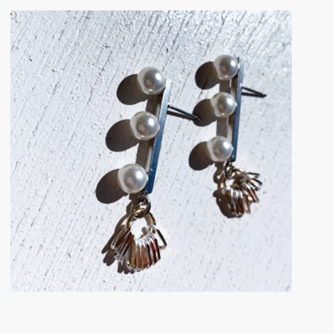 小粒パールが3粒連なったピアスパーツにゴールド×シルバーのコラボが可愛いパーツをぶら下げたお品!