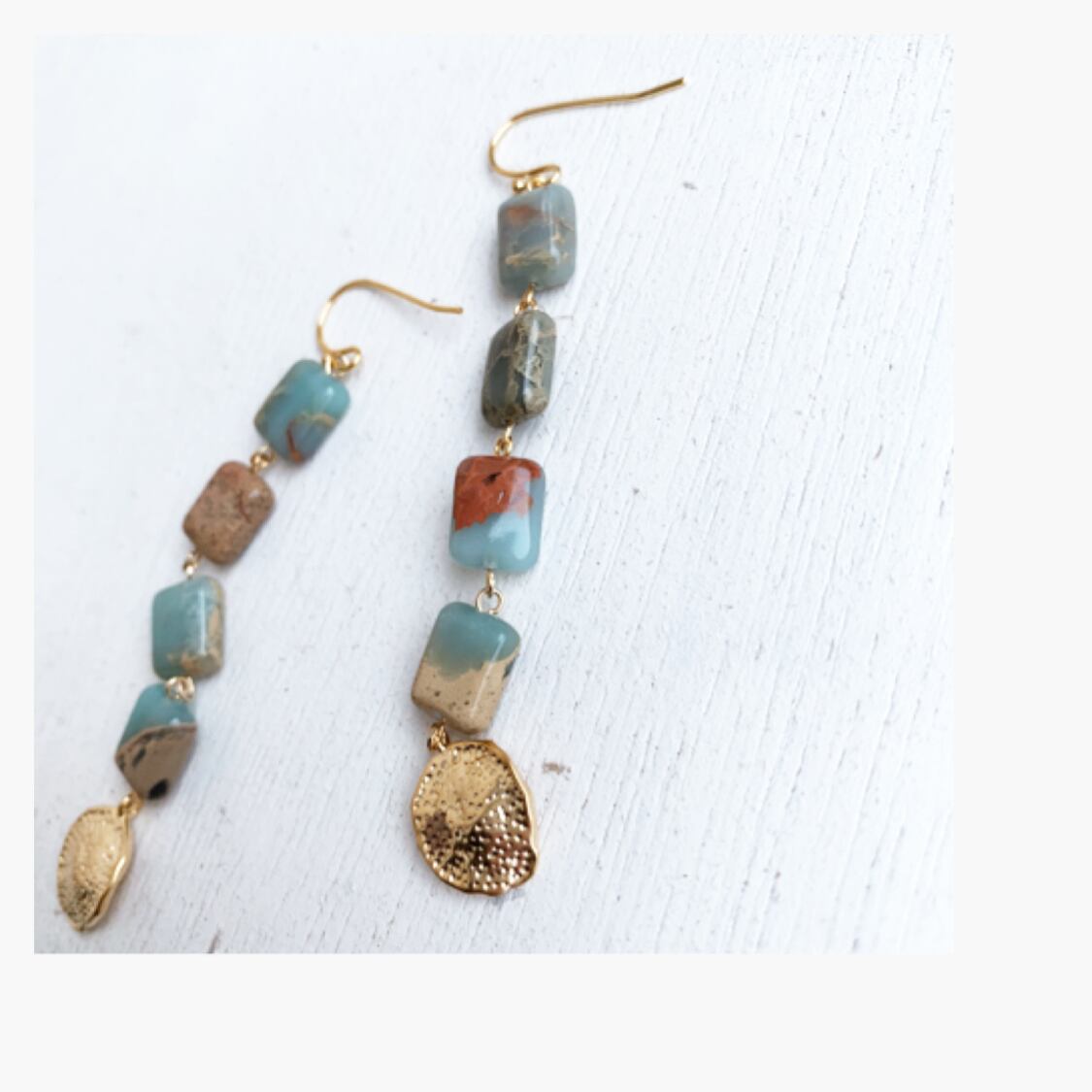 インプラッシュストーンとグリーンとブラウンの色味が独特の個性を出してくれるピアス、イヤリングです。