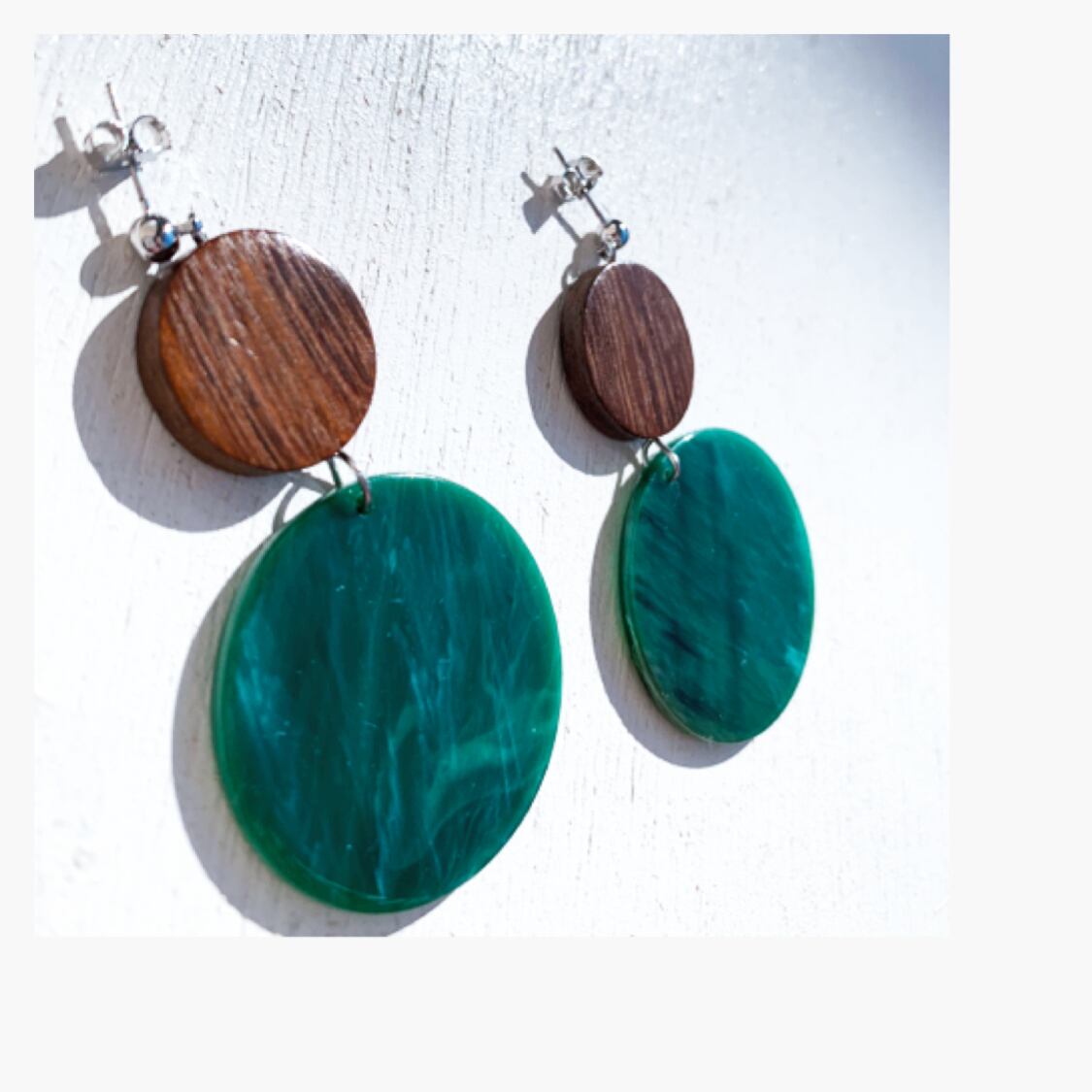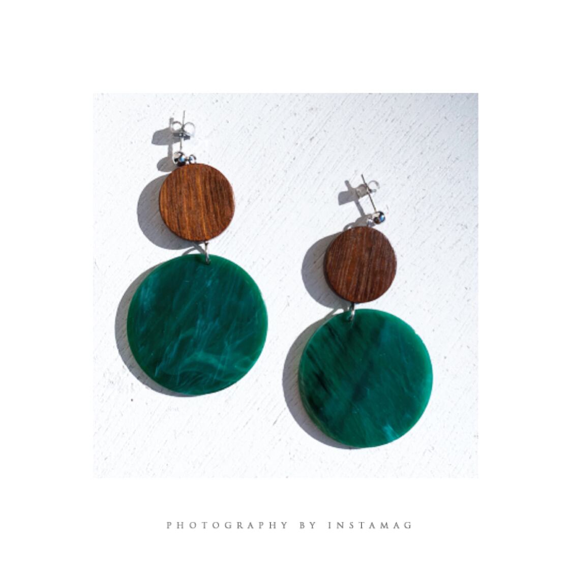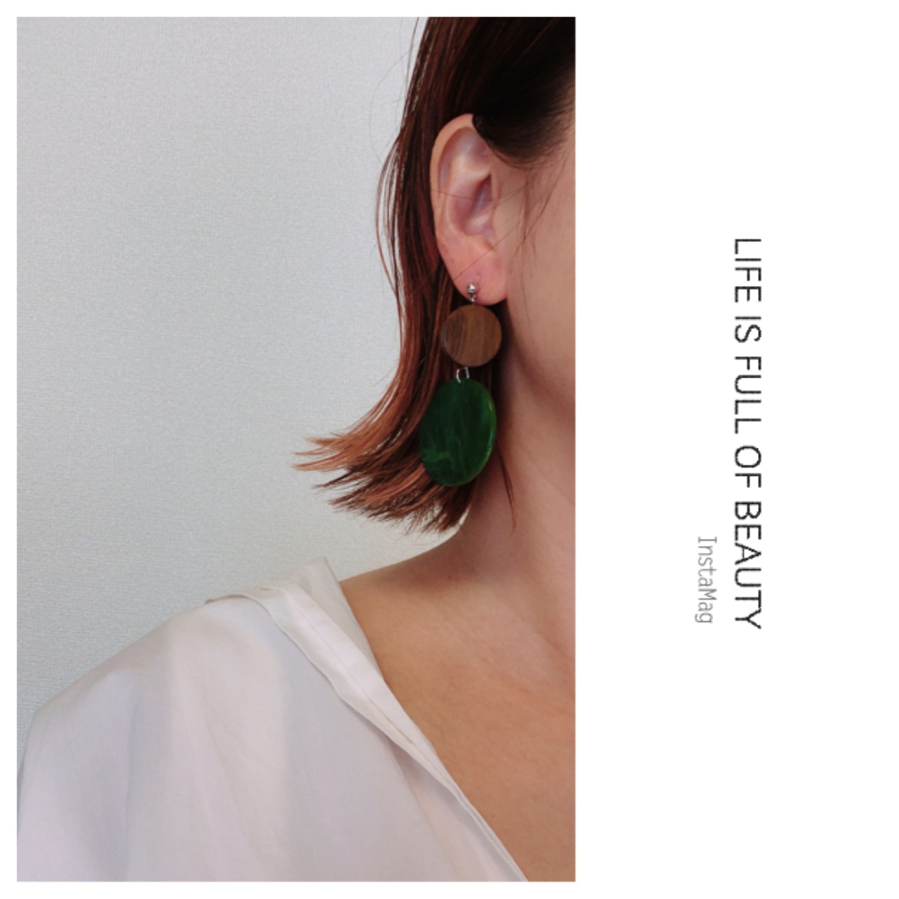マーブルグリーンに惹かれたパーツをメインにウッドと合わせた大振りなピアス、イヤリングです。