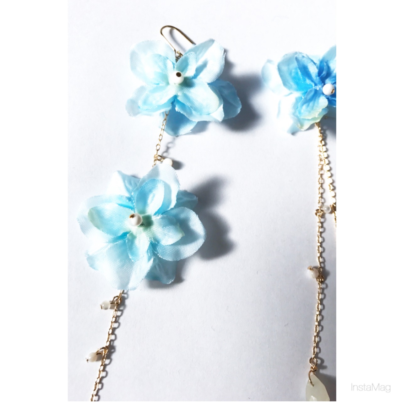 ブルーのお花とイエローとホワイトの天然石を合わせて、左右デザインの違うアシメントリーのピアス、イヤリングです。