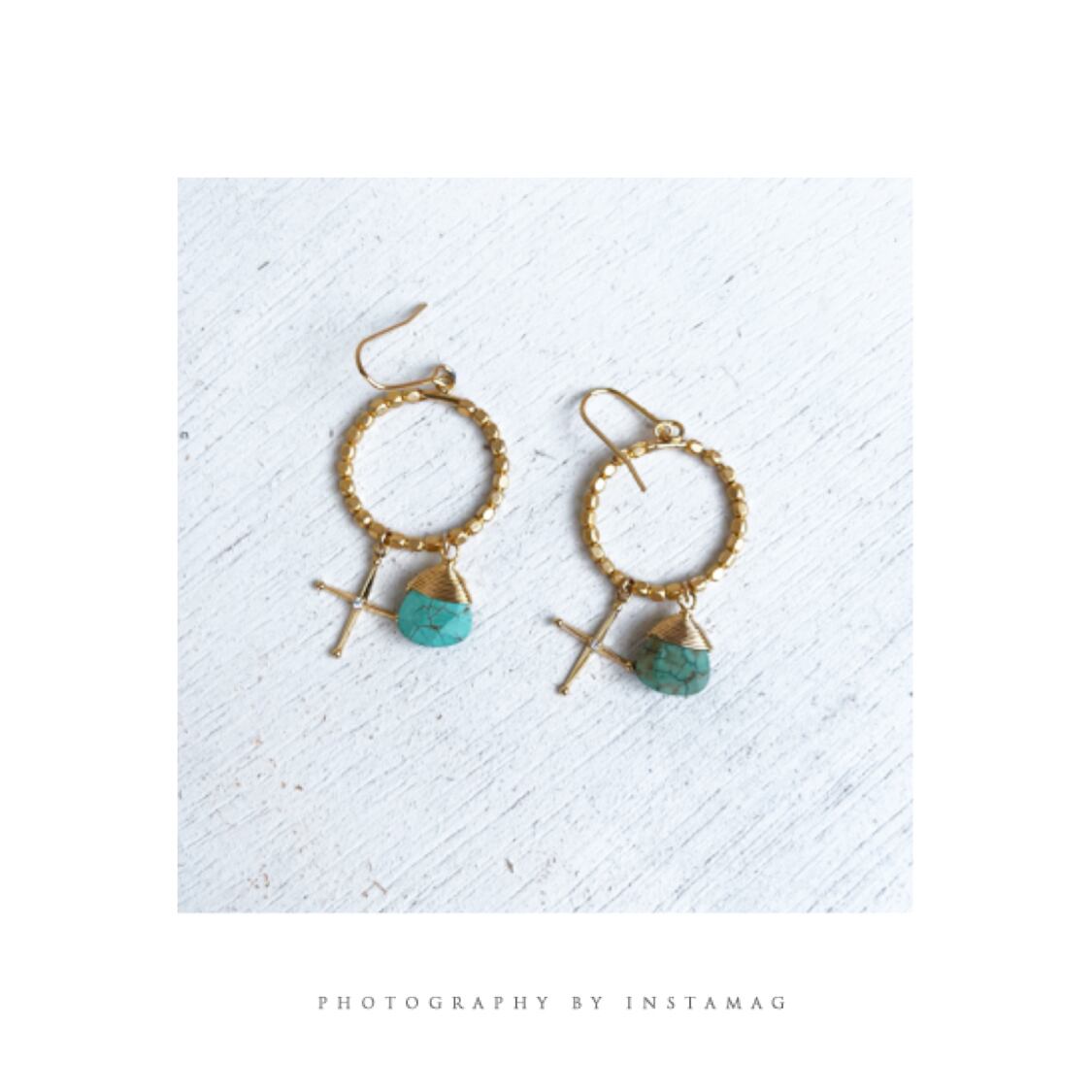 華奢なクロスパーツにマロン型のターコイズを合わせたありそうてないデザインのピアス、イヤリングです。