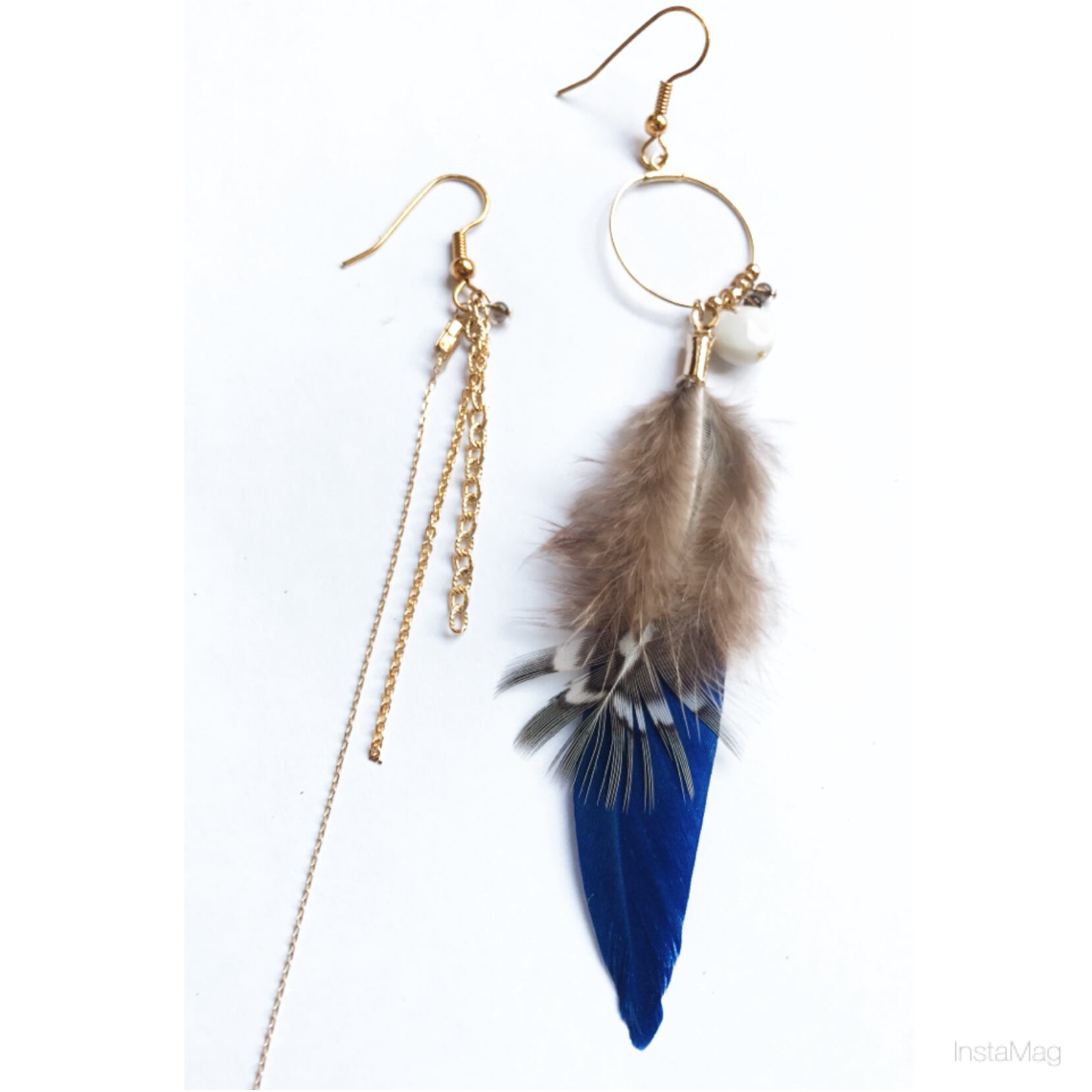 ターコイズブルーかネイビーの羽とブラウン系の羽を合わせて、ハウライトとオニキスとスモーキークォーツを使用した左右デザインの違うアシメントリーピアス、イヤリングです。