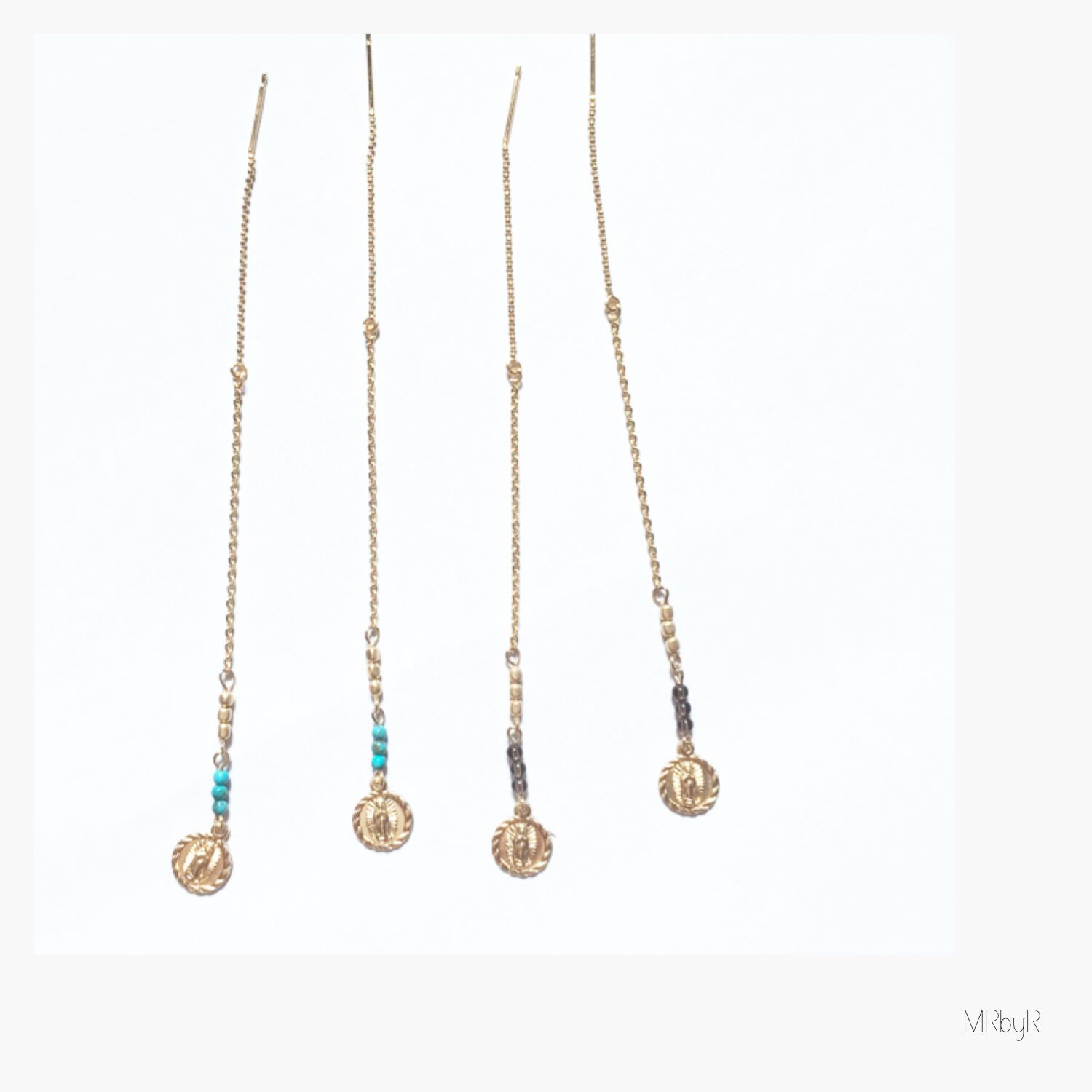 14kgf素材の小さなマリアコインと、ターコイズかスモーキークォーツの石を合わせてシンプルに、どんなスタイルにも合わせやすいアメリカンピアス、イヤリングです。