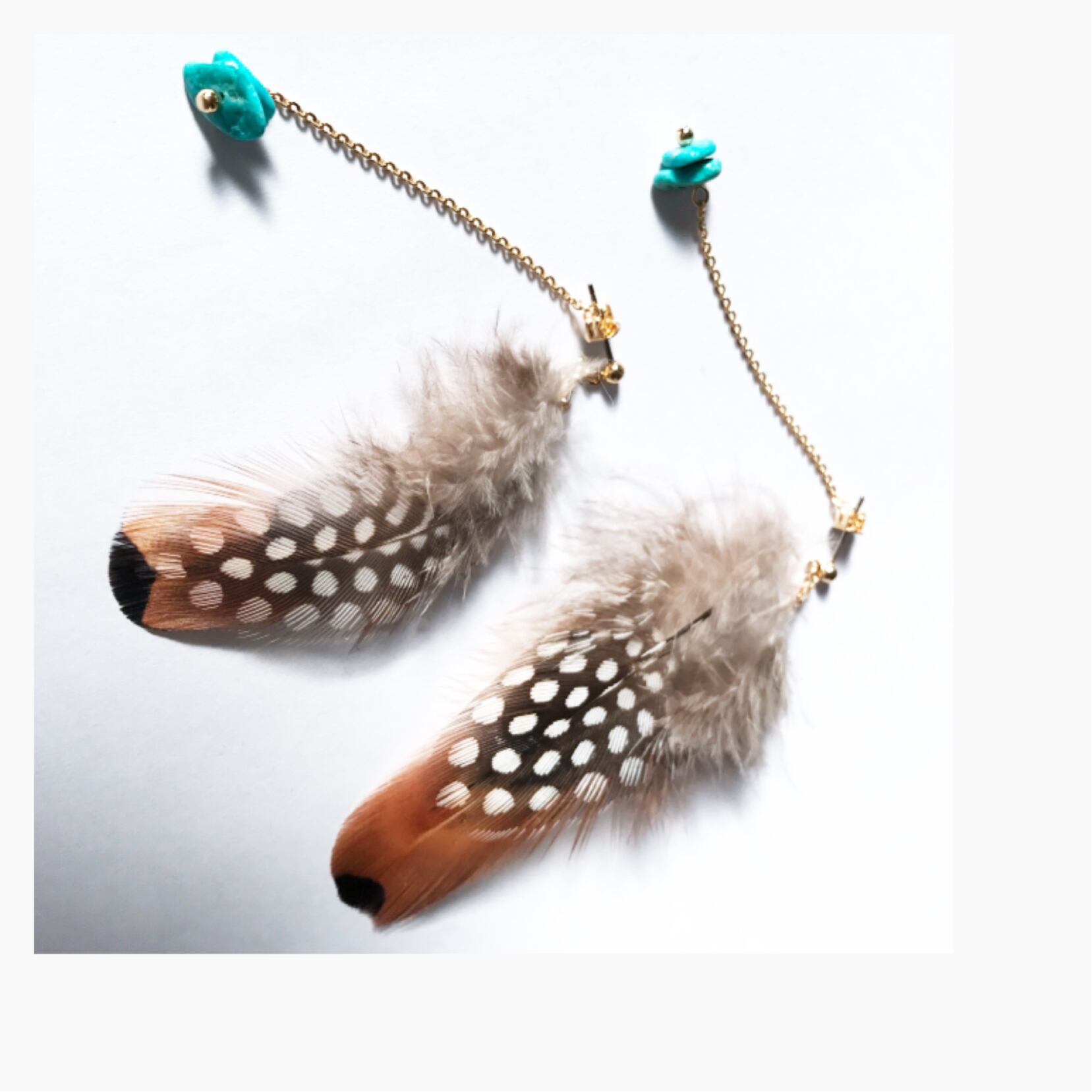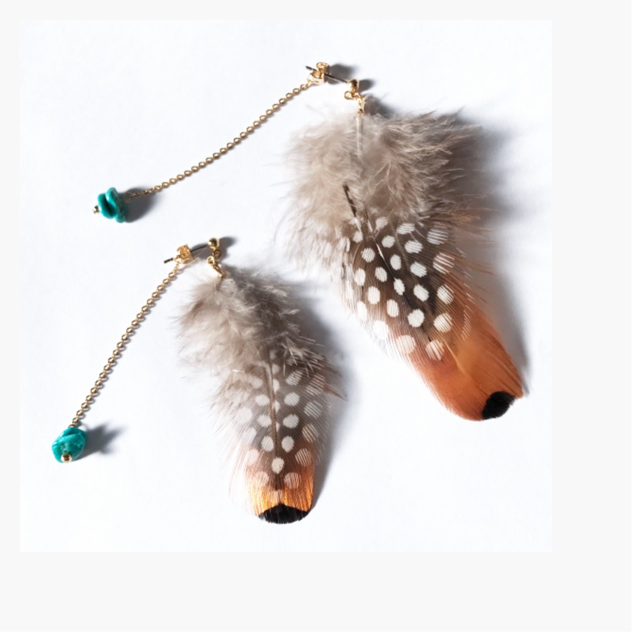 2枚を合わせボリュームを出した羽をメインに、キャッチから垂れるコロコロしたターコイズのピアス。