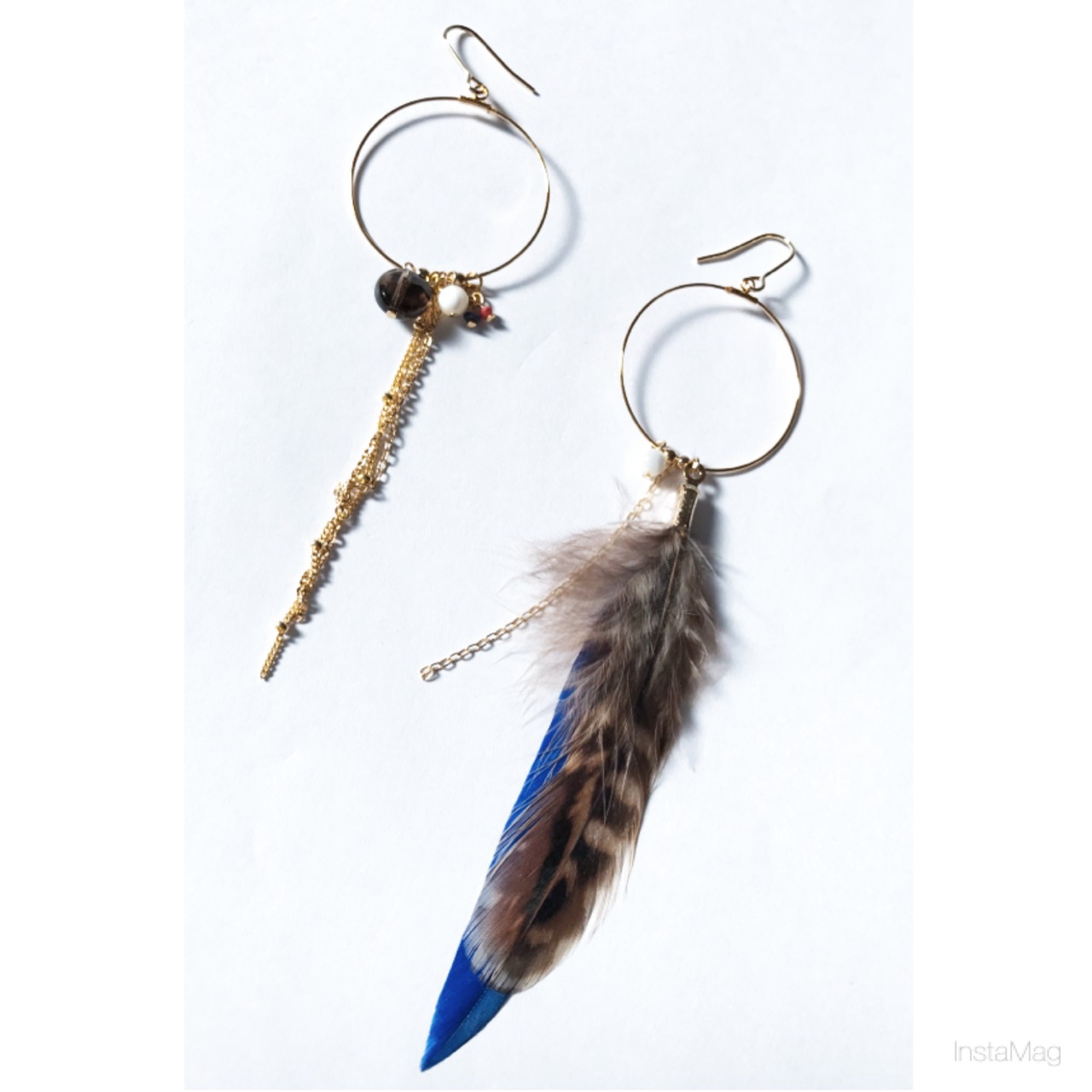 ネイビーの羽が大人ぽさを出して、左右デザインの違うアシメントリーで、人と差をつけたオシャレを!